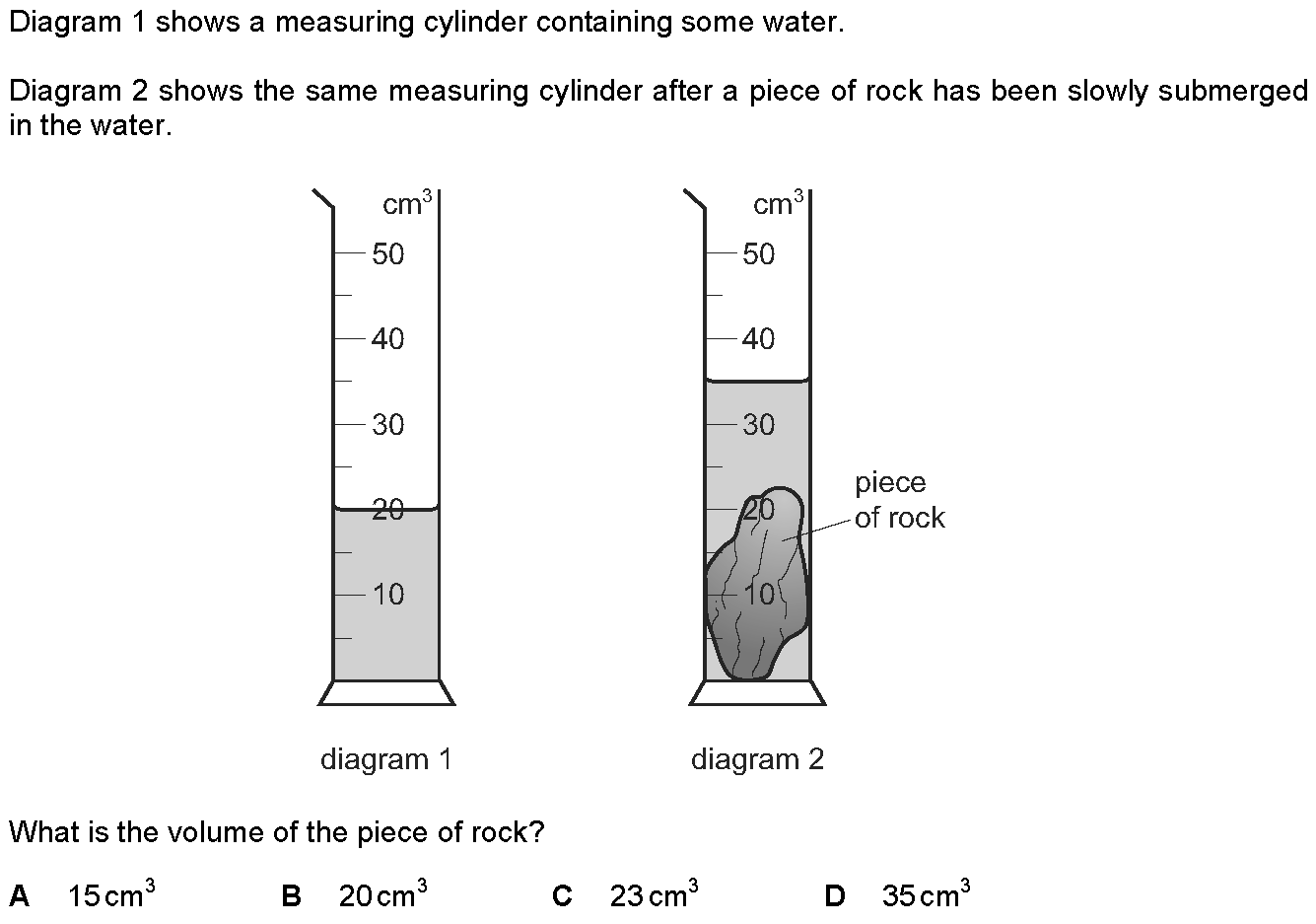 The volume of a stone is to be found using the equipment illustrated in Fig. 1.1. [Image_1: Fig. 1.1 showing a stone, measuring cylinder, and water] T...