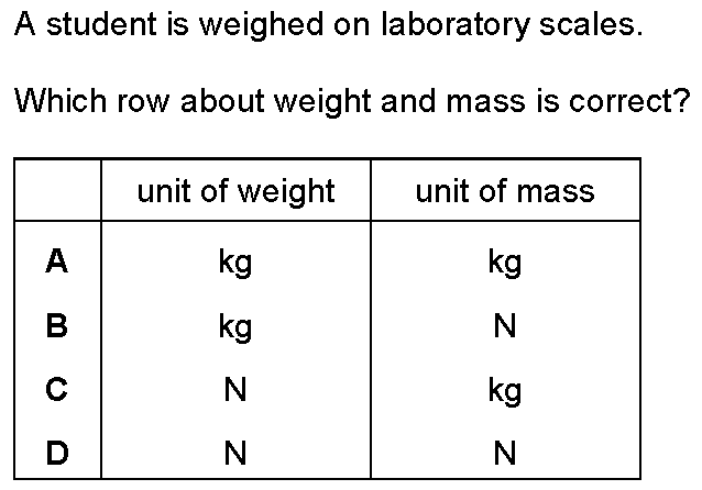 A student is weighed on laboratory scales.Which row about weight and mass is correct?[Table_1]
