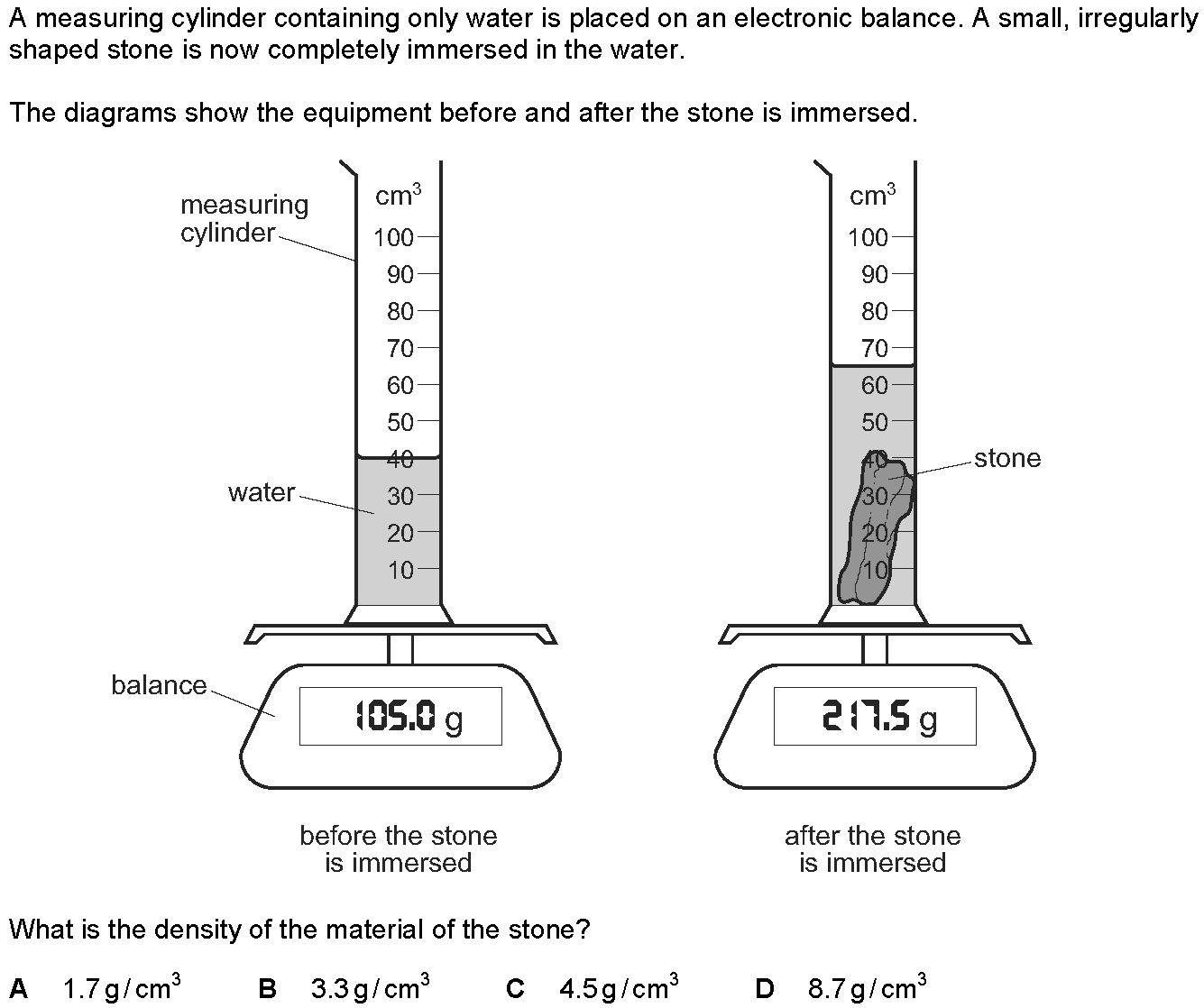 A measuring cylinder containing only water is placed on an electronic balance. A small, irregularly shaped stone is now completely immersed in the wat...