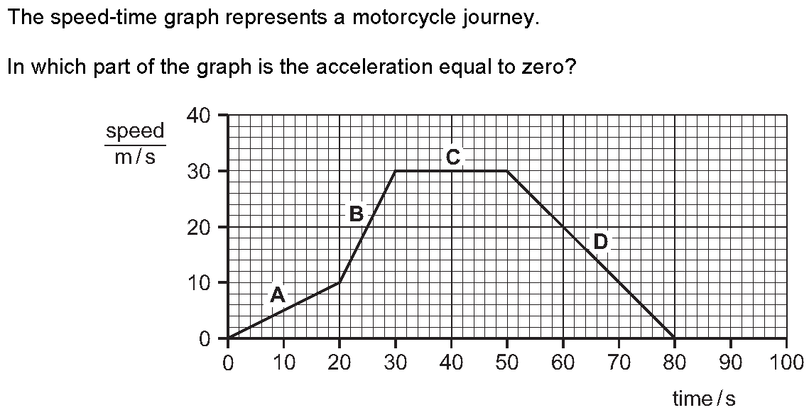 The speed-time graph represents a motorcycle journey. In which part of the graph is the acceleration equal to zero? [Image_1: Speed-time graph with ...