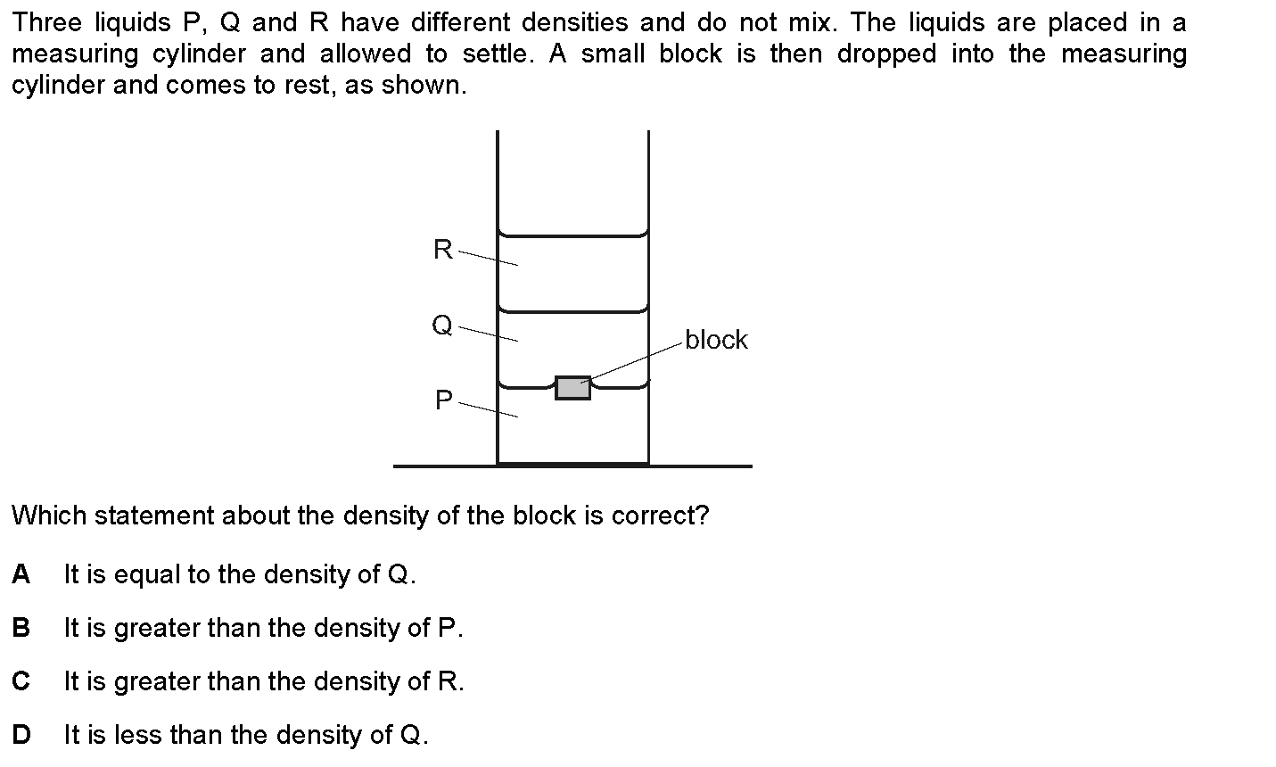Three liquids P, Q and R have different densities and do not mix. The liquids are placed in a measuring cylinder and allowed to settle. A small block ...