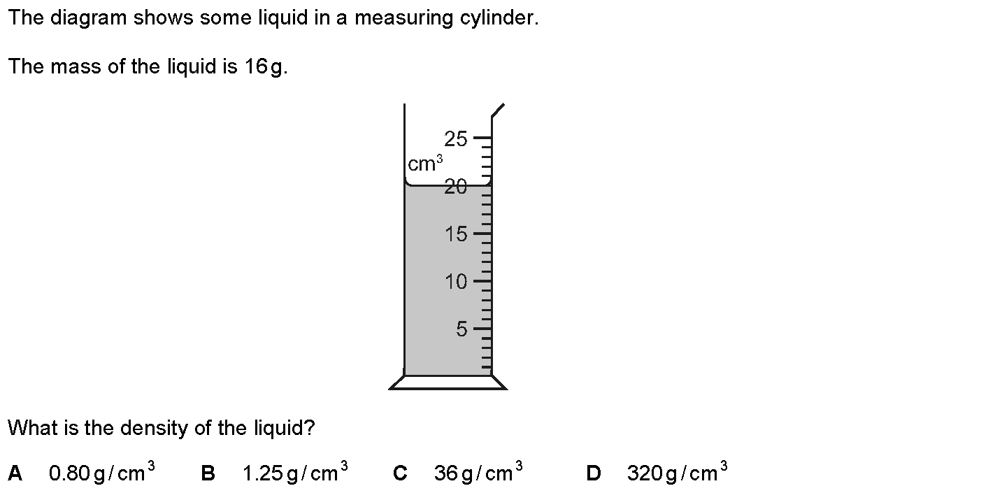 The diagram shows some liquid in a measuring cylinder.The mass of the liquid is 16g.What is the density of the liquid?