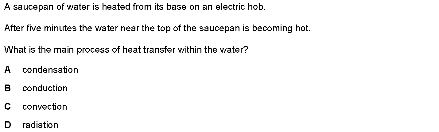 Energy may be transferred from one place to another by means of conduction, convection or radiation. Which process is involved when energy is transfer...