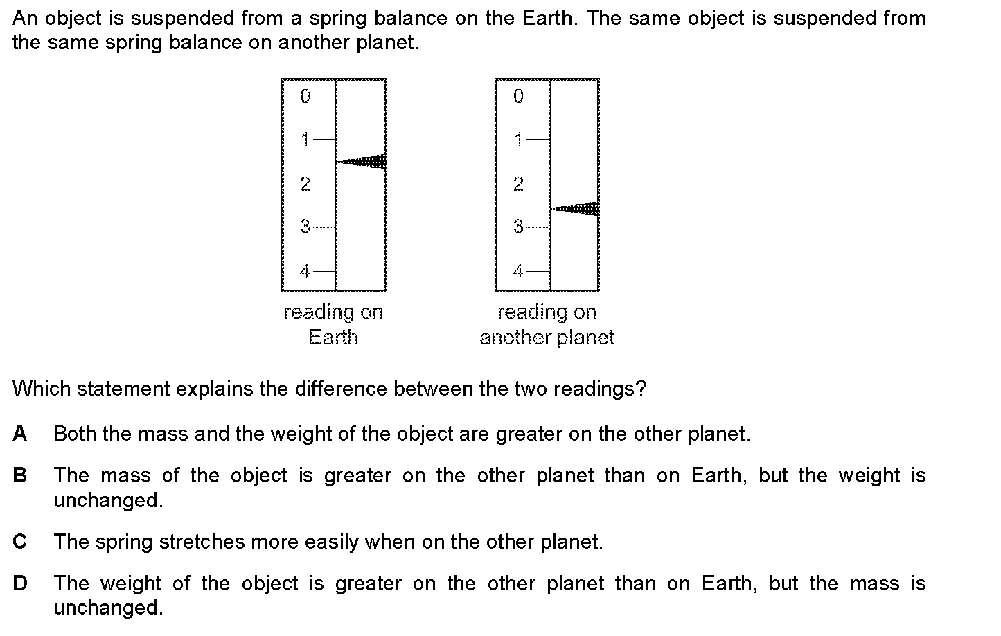 Diagram 1 shows a beam balance. A beaker with a wire loop balances the standard masses. The beaker is then removed and hung from a spring. The spring ...