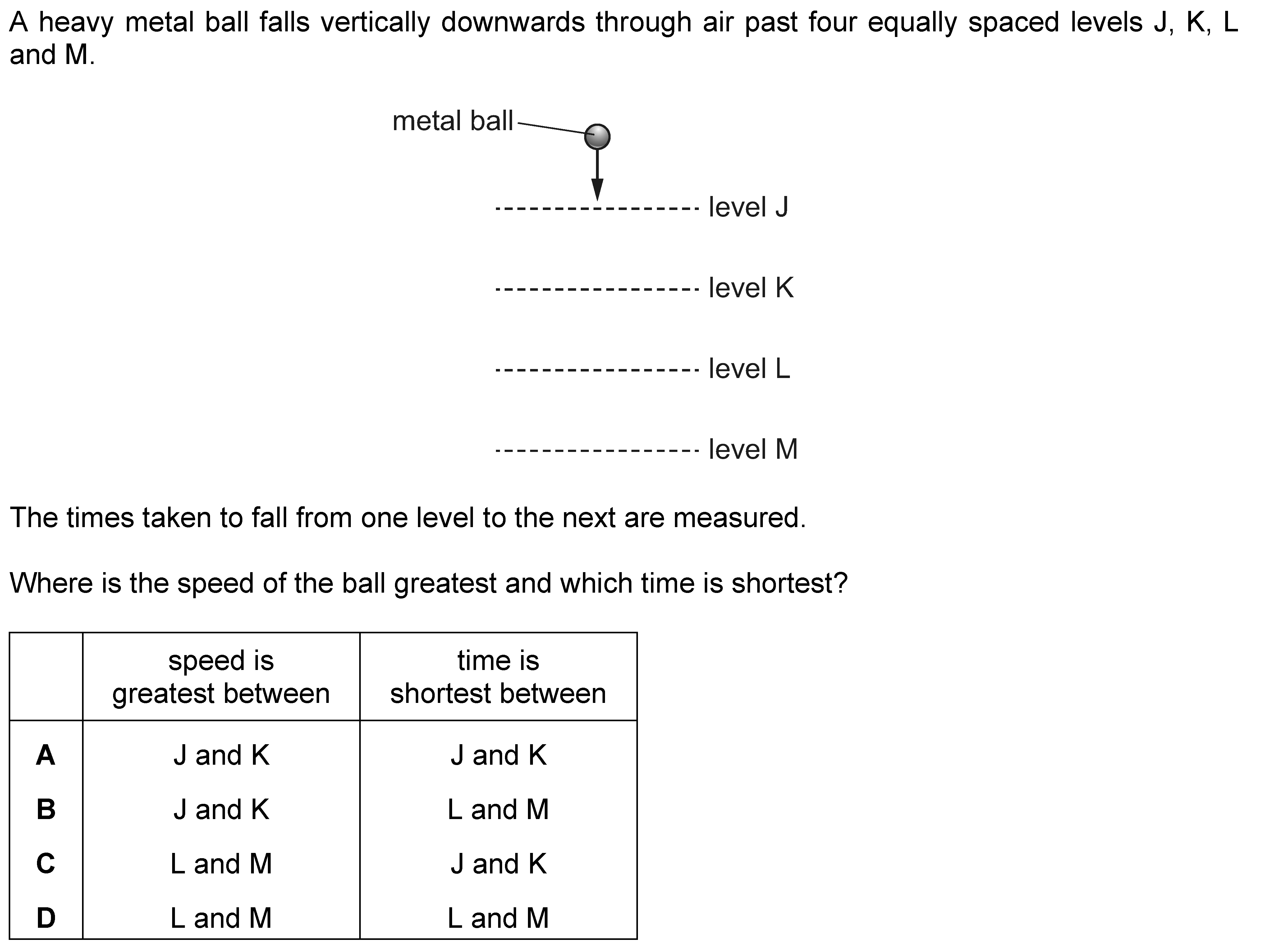 A heavy metal ball falls vertically downwards through air past four equally spaced levels J, K, L and M.The times taken to fall from one level to the ...