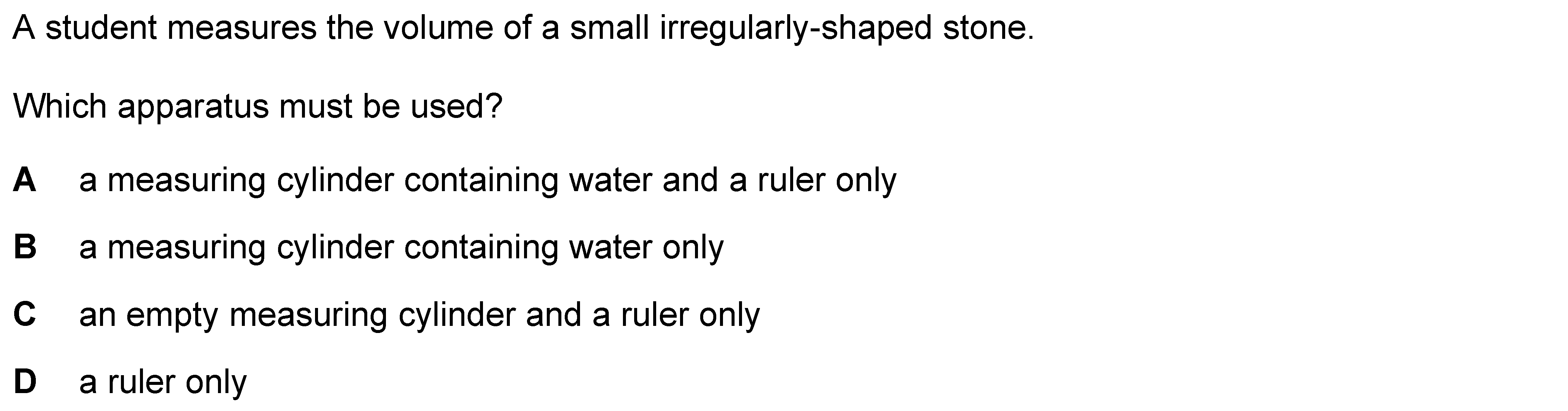 The volume of a stone is to be found using the equipment illustrated in Fig. 1.1. [Image_1: Fig. 1.1 showing a stone, measuring cylinder, and water] T...