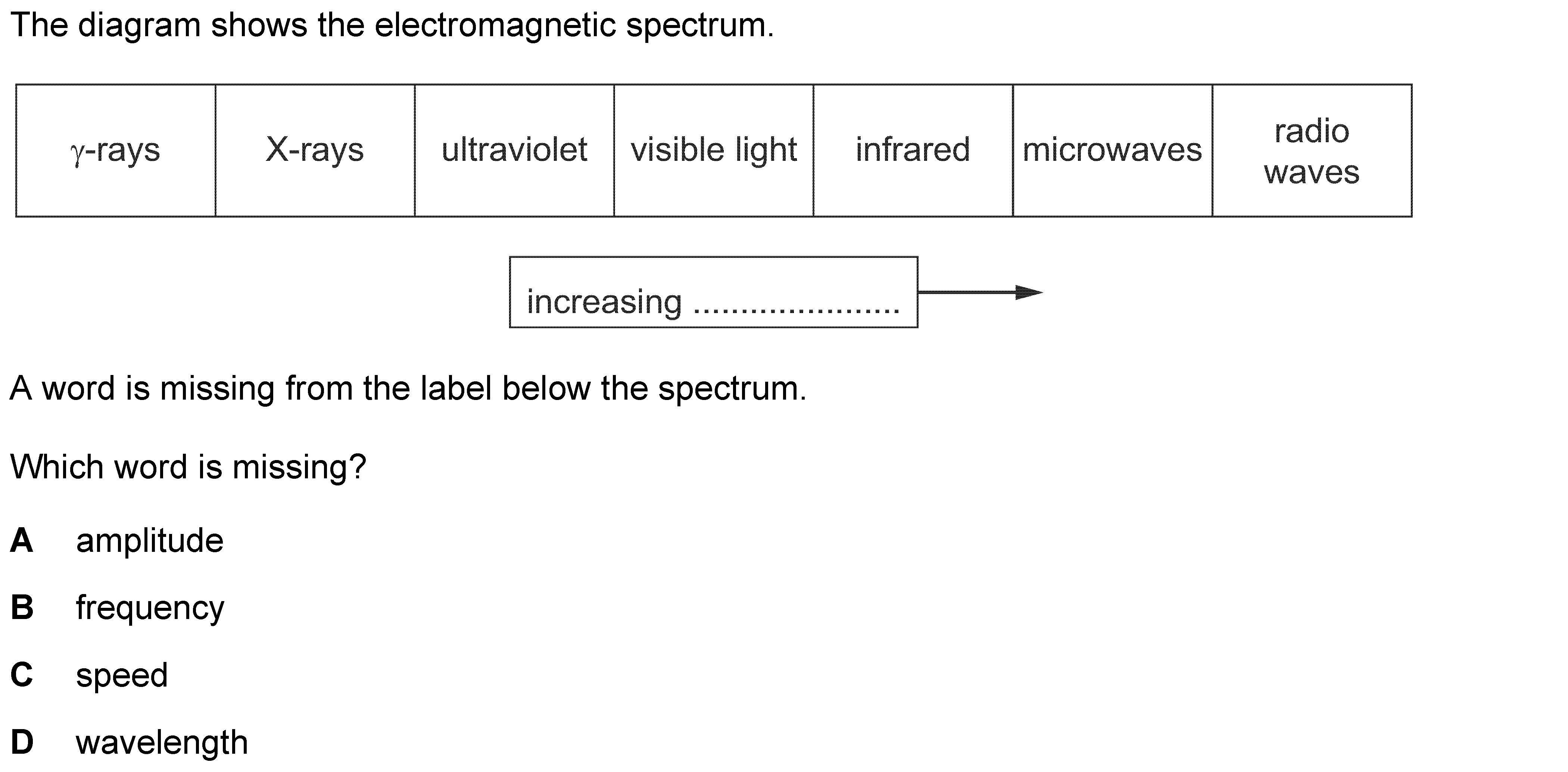 The list below contains the names of the various regions of the electromagnetic spectrum, but they are in the wrong order and an extra, non-electromag...
