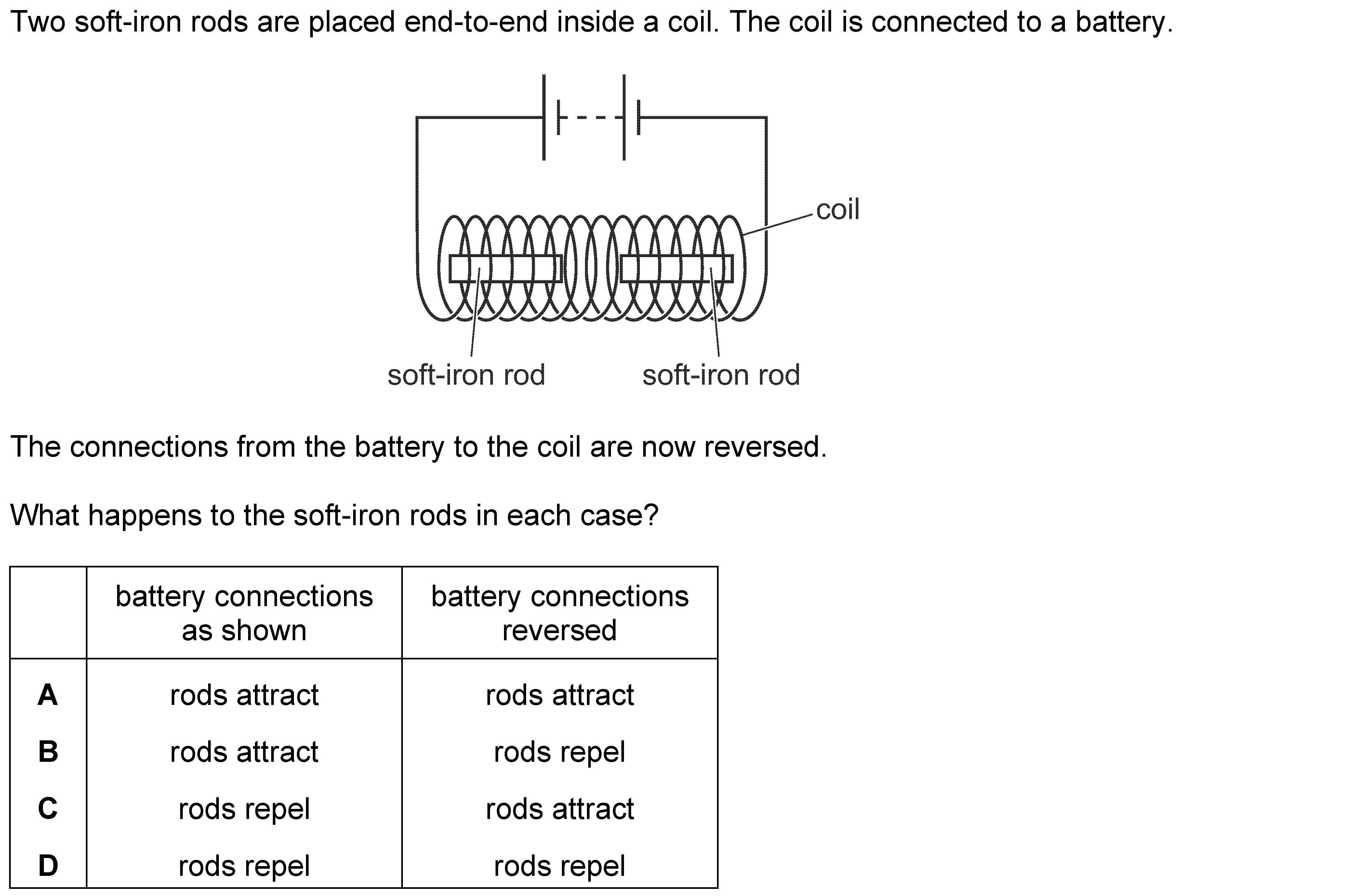 The pivoted steel arrow from a small compass has become demagnetised. The coil shown in Fig. 7.1 is to be used to magnetise it again. (a) Describe ca...