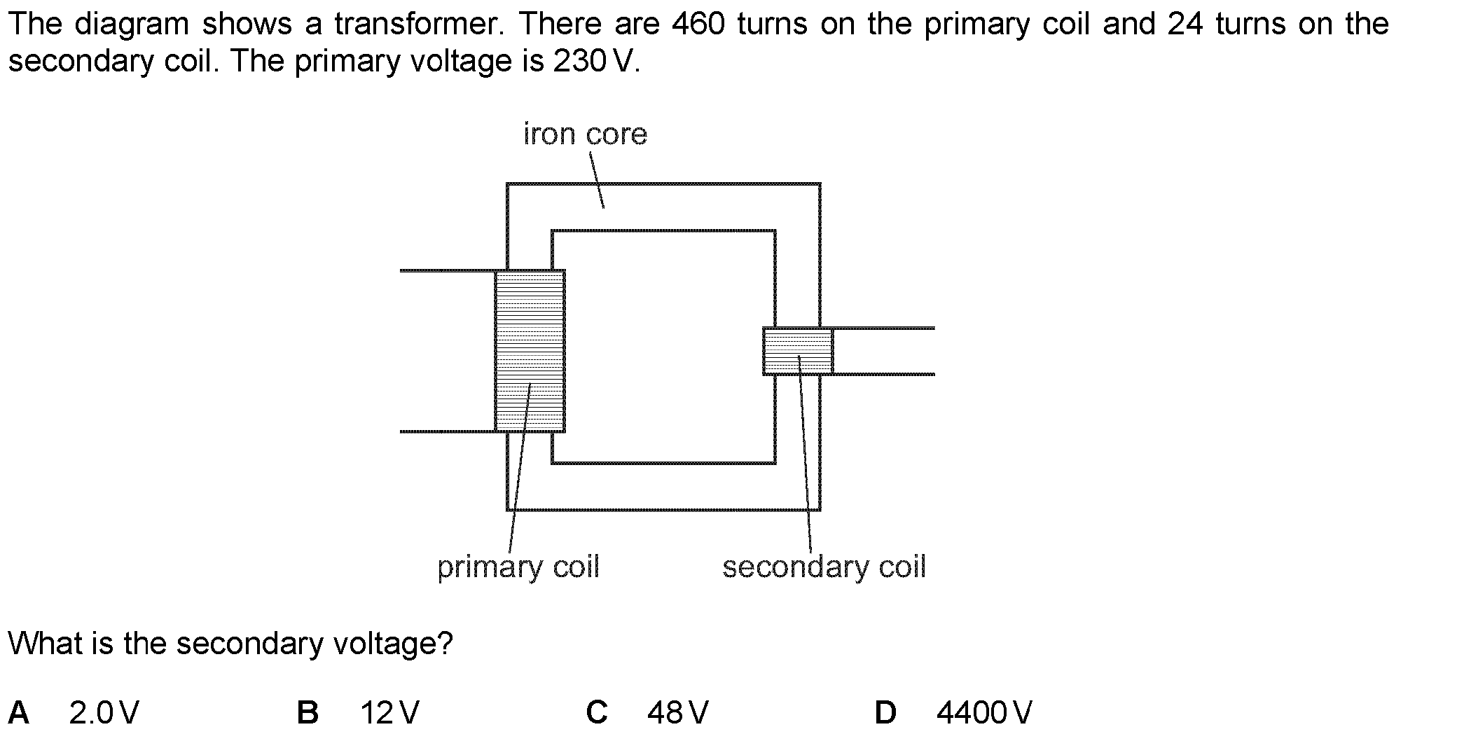 A 240V a.c. mains supply is connected to the primary coil of the transformer shown in Fig. 10.1. A lamp that gives full brightness with a 6V supply is...