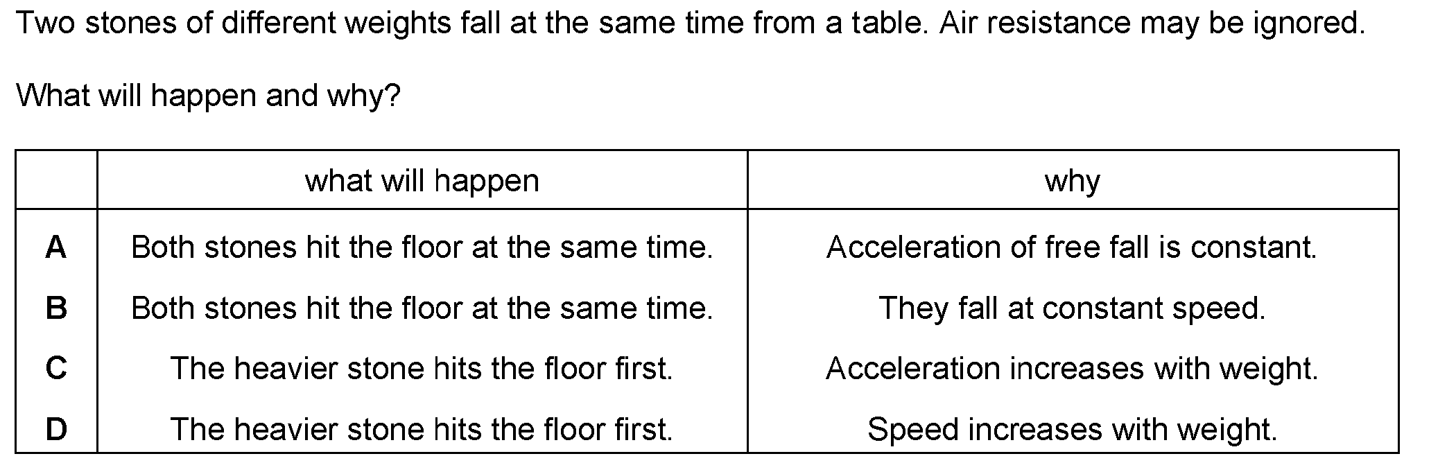Two stones of different weights fall at the same time from a table. Air resistance may be ignored. What will happen and why? [Table_1]