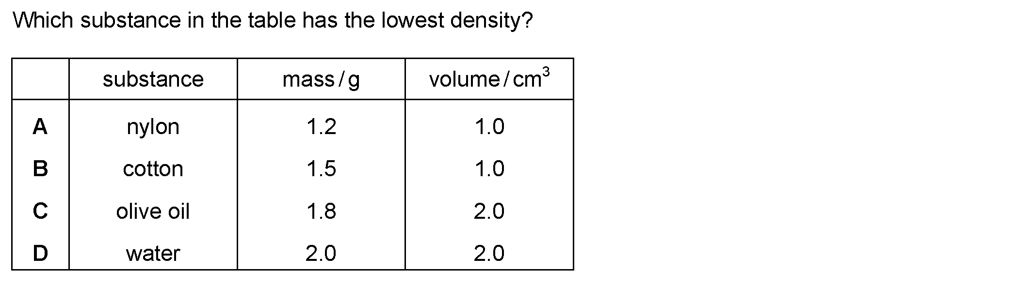 The diagram shows a stone of irregular shape. Which property of the stone can be found by lowering it into a measuring cylinder half-filled with wat...