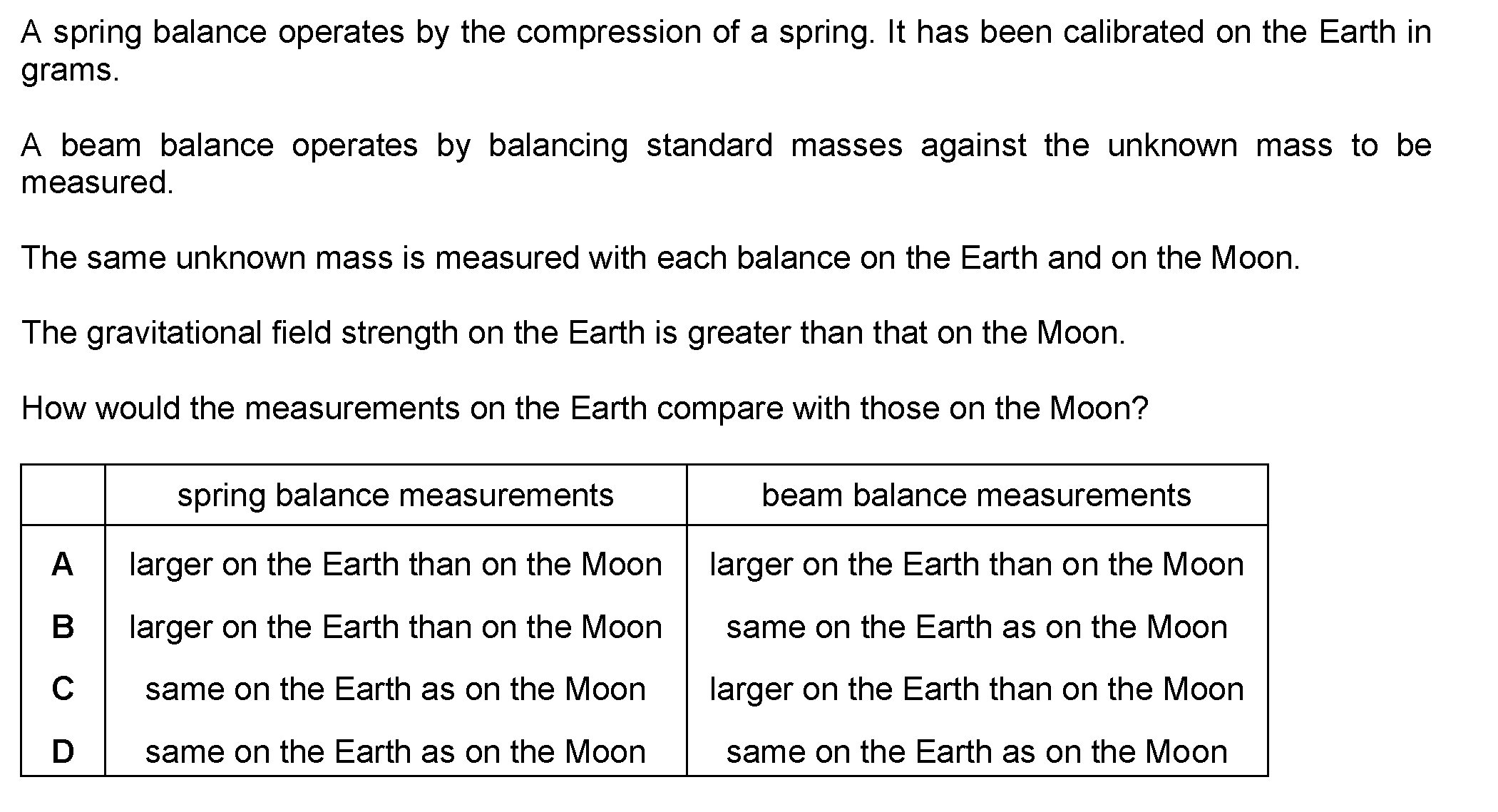 A spring balance operates by the compression of a spring. It has been calibrated on the Earth in grams.A beam balance operates by balancing standard m...