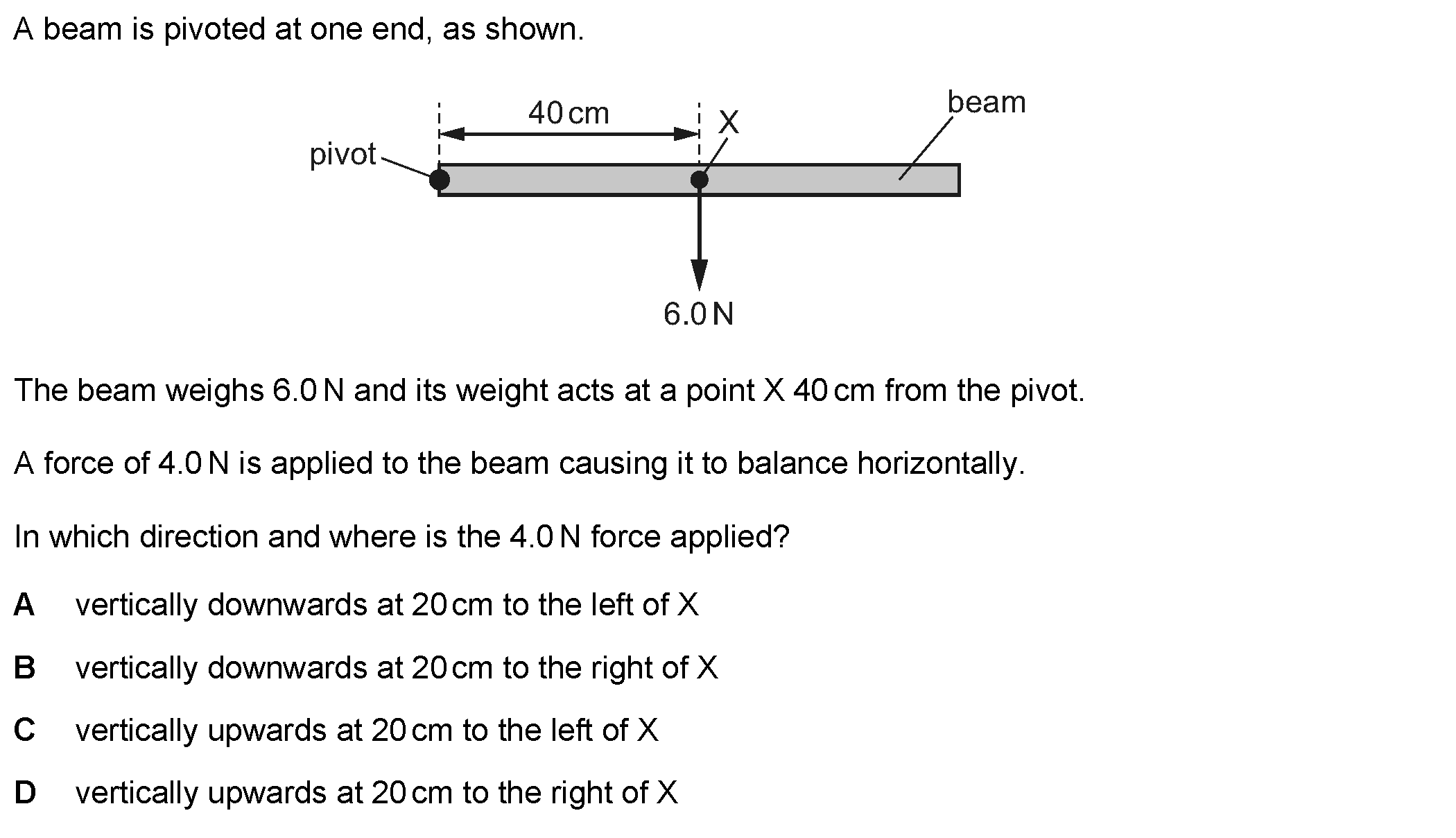 A beam is pivoted at one end, as shown. The beam weighs 6.0 N and its weight acts at a point X 40 cm from the pivot.A force of 4.0 N is applied to the...