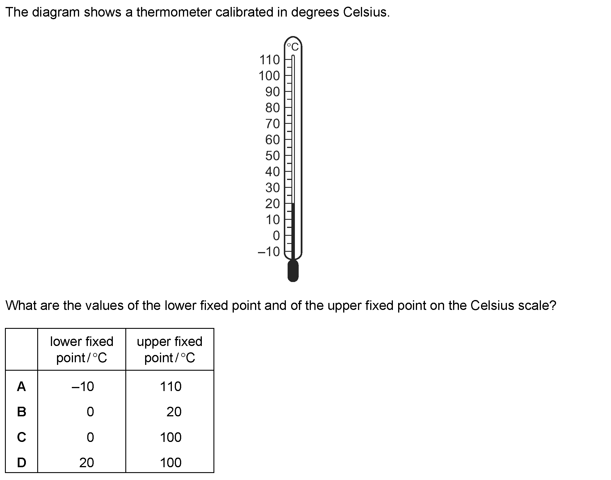 The liquid-in-glass thermometer in Fig. 6.1 has a scale from -10°C to 110°C.(a) Two of the temperatures marked on the thermometer are known as fixed...