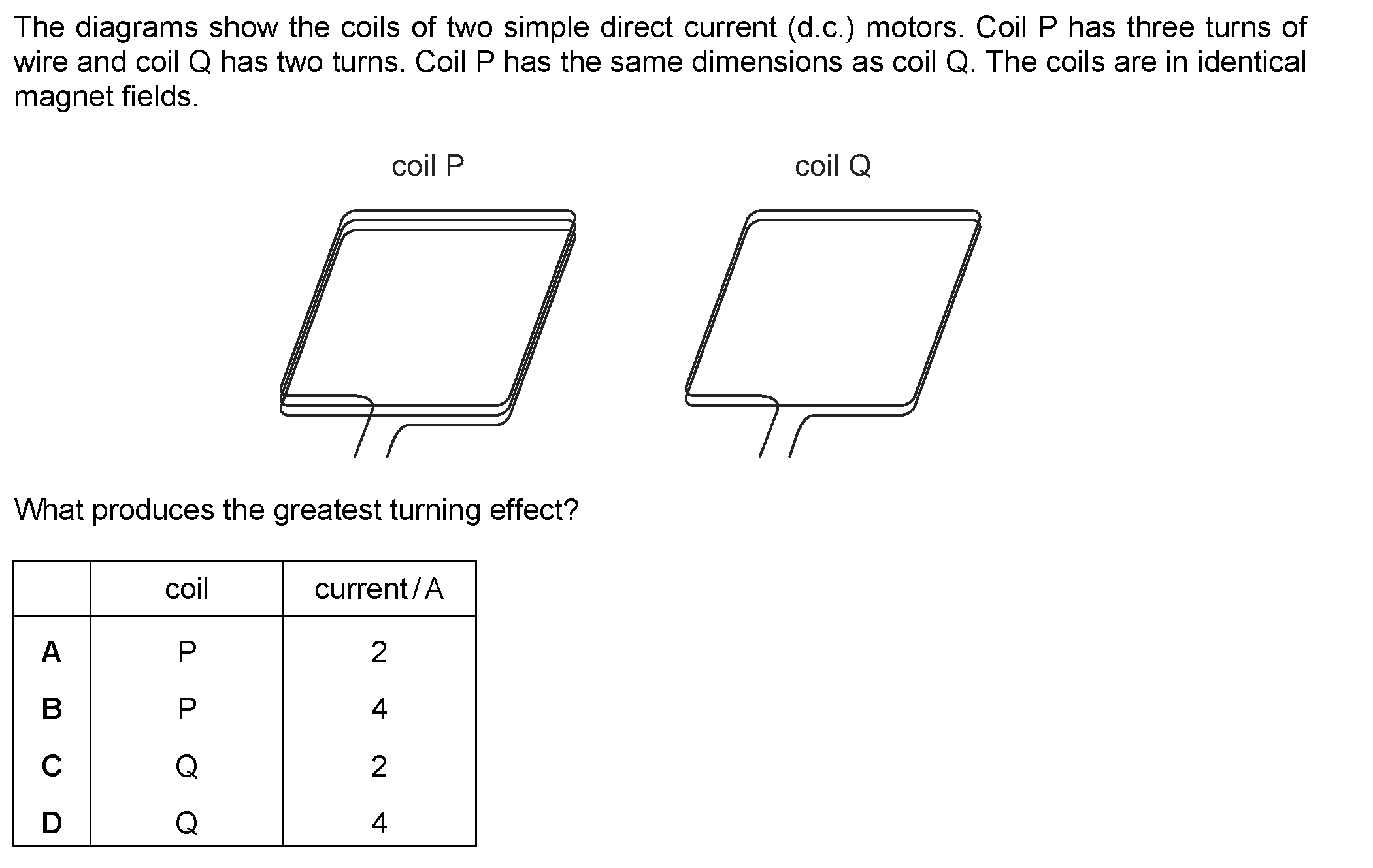 The coil in the d.c. motor in Fig. 9.1 is rotating as shown. (a) On Fig. 9.1, clearly label the coil. [1](b) State two things that could be done to th...