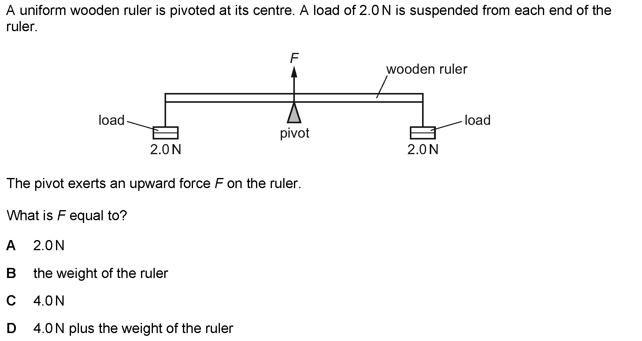 The diagram shows a uniform metre rule. The rule is pivoted at its mid-point. A weight of 4.0 N is suspended from the rule at the 5 cm mark. The rule ...