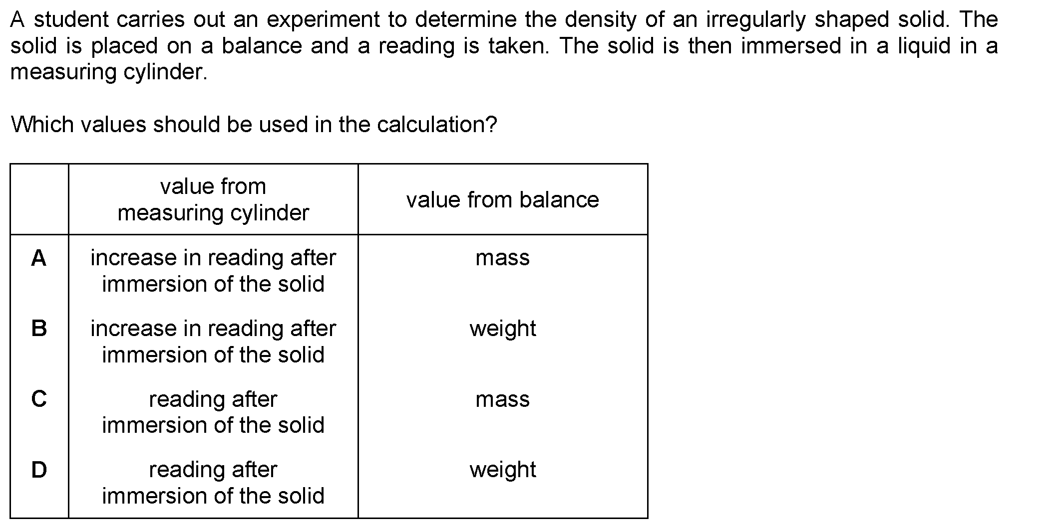 A student determines the density of an irregularly shaped stone. The stone is slowly lowered into a measuring cylinder partly filled with water. Which...