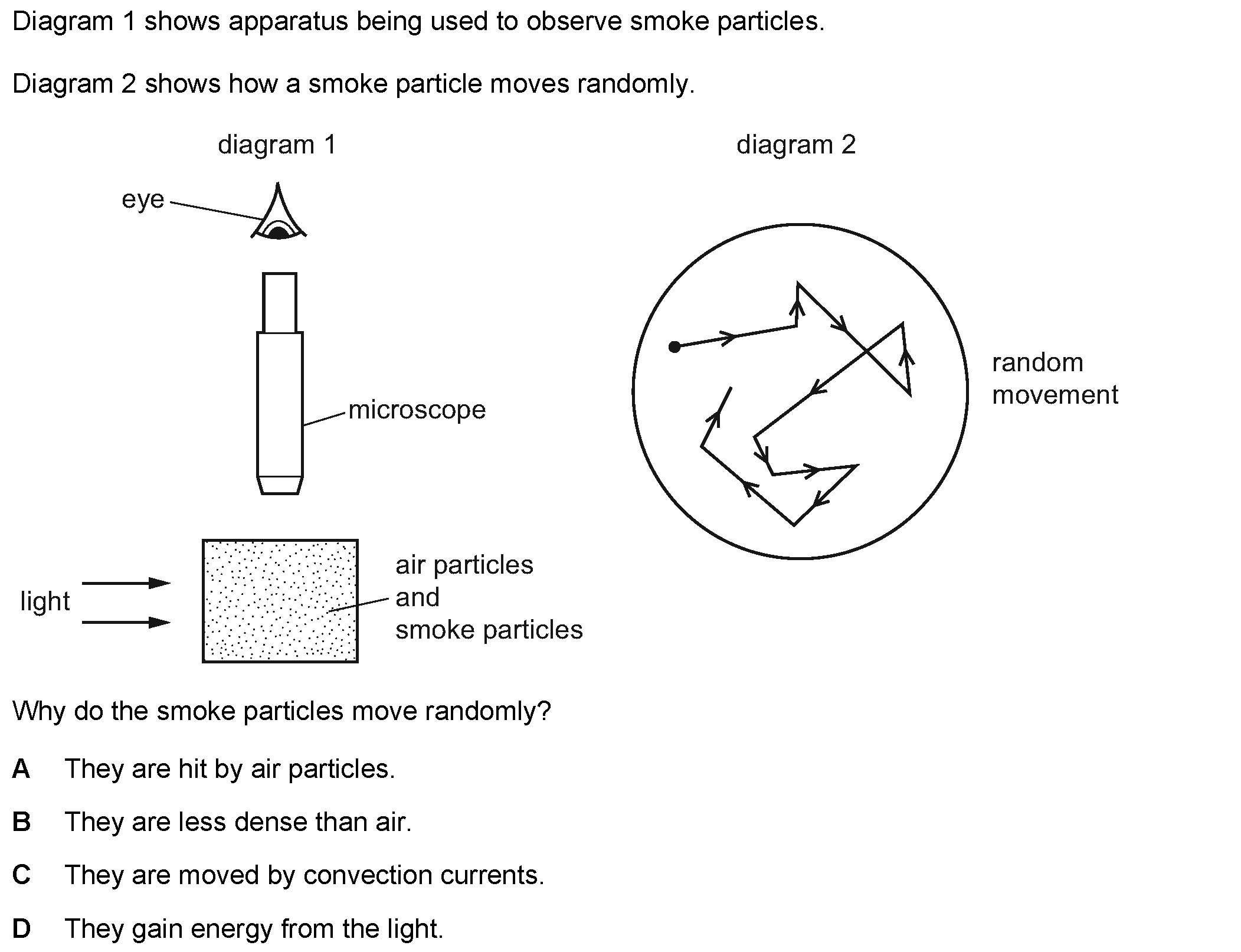 Diagram 1 shows apparatus being used to observe smoke particles. Diagram 2 shows how a smoke particle moves randomly. Why do the smoke particles move ...