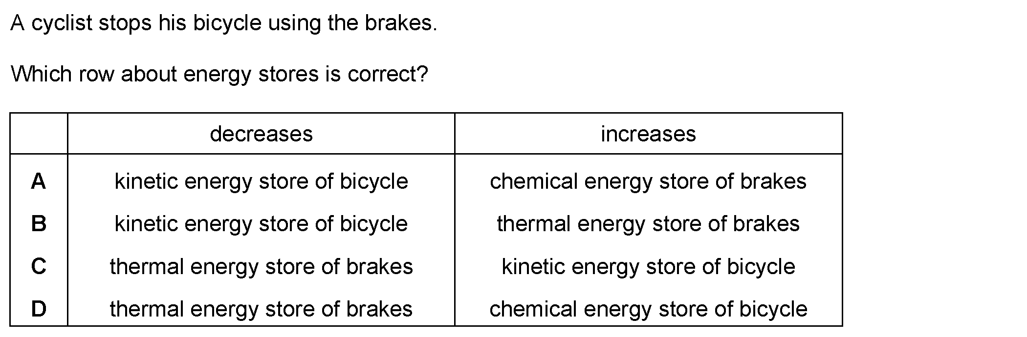 A cyclist stops his bicycle using the brakes. Which row about energy stores is correct? [Table_1]