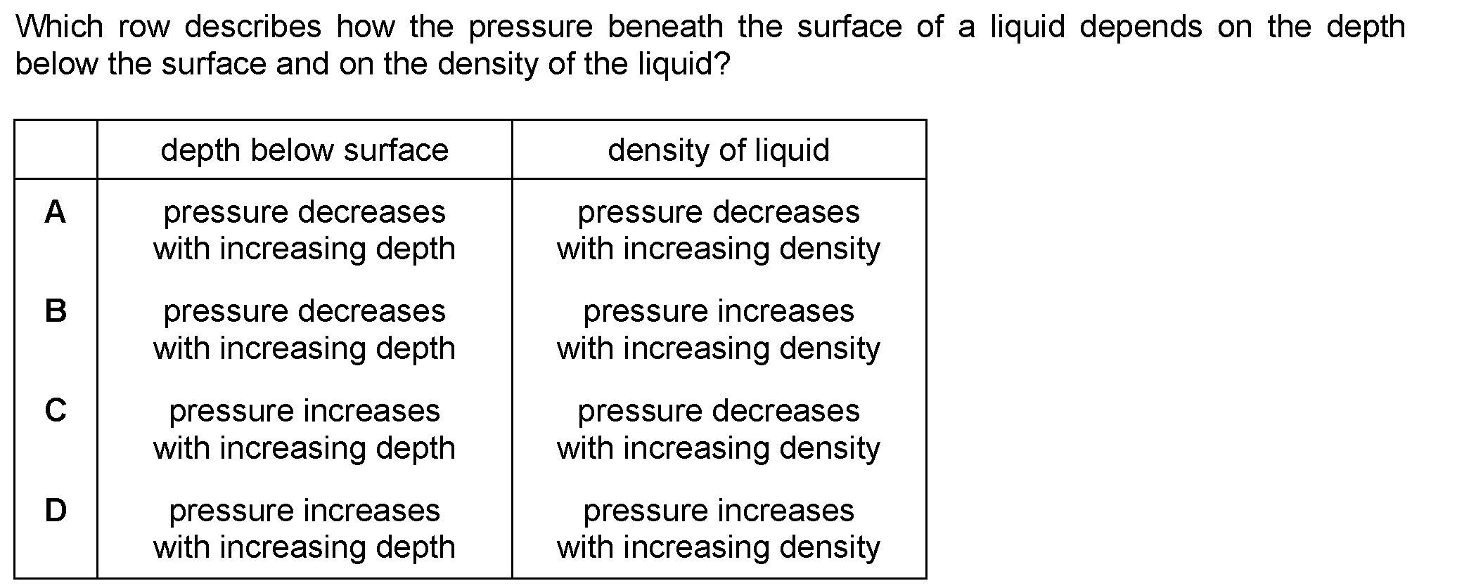 The diagram shows two objects, X and Y, suspended from identical springs. The extension of each spring is different.Which row compares the mass and th...