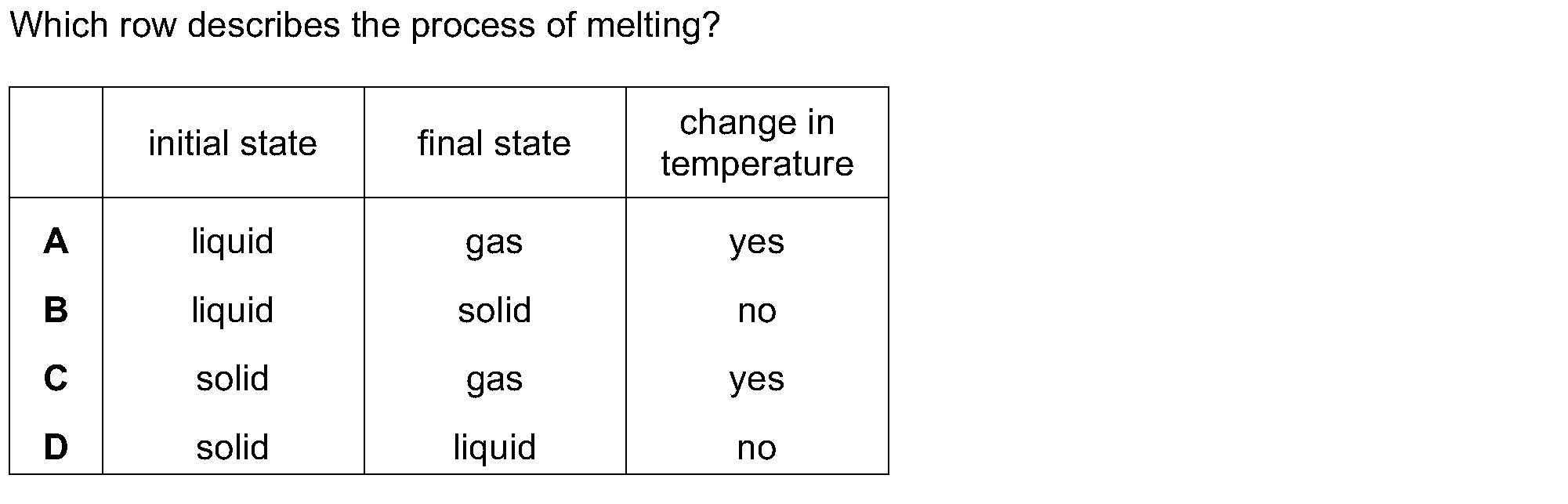 Some terms describing changes of state are listed.1. boiling2. solidification3. condensation4. evaporationWhich two terms identify the same change of ...