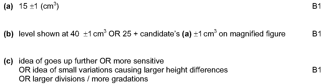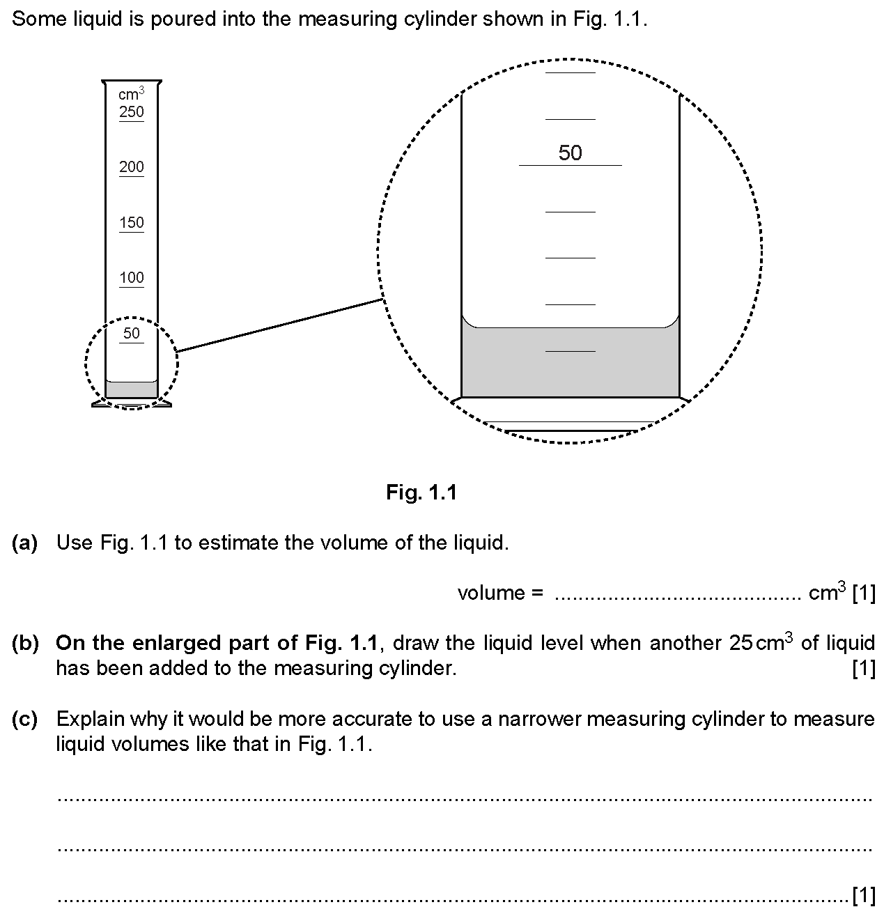 Fig. 1.1 shows a measuring cylinder containing some water.A student allows 200 drops of water to fall into the water in the measuring cylinder. Fig. 1...