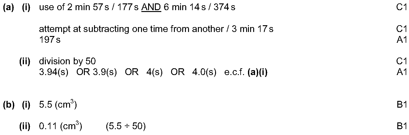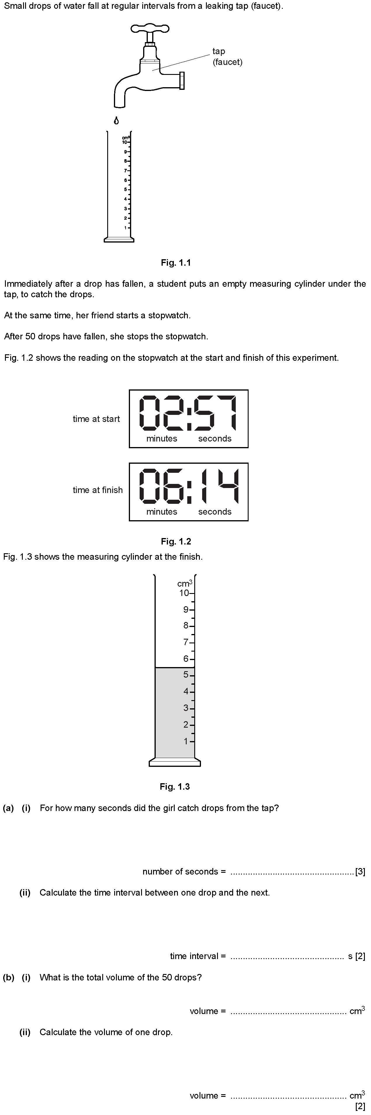 Fig. 1.1 shows a measuring cylinder containing some water.A student allows 200 drops of water to fall into the water in the measuring cylinder. Fig. 1...