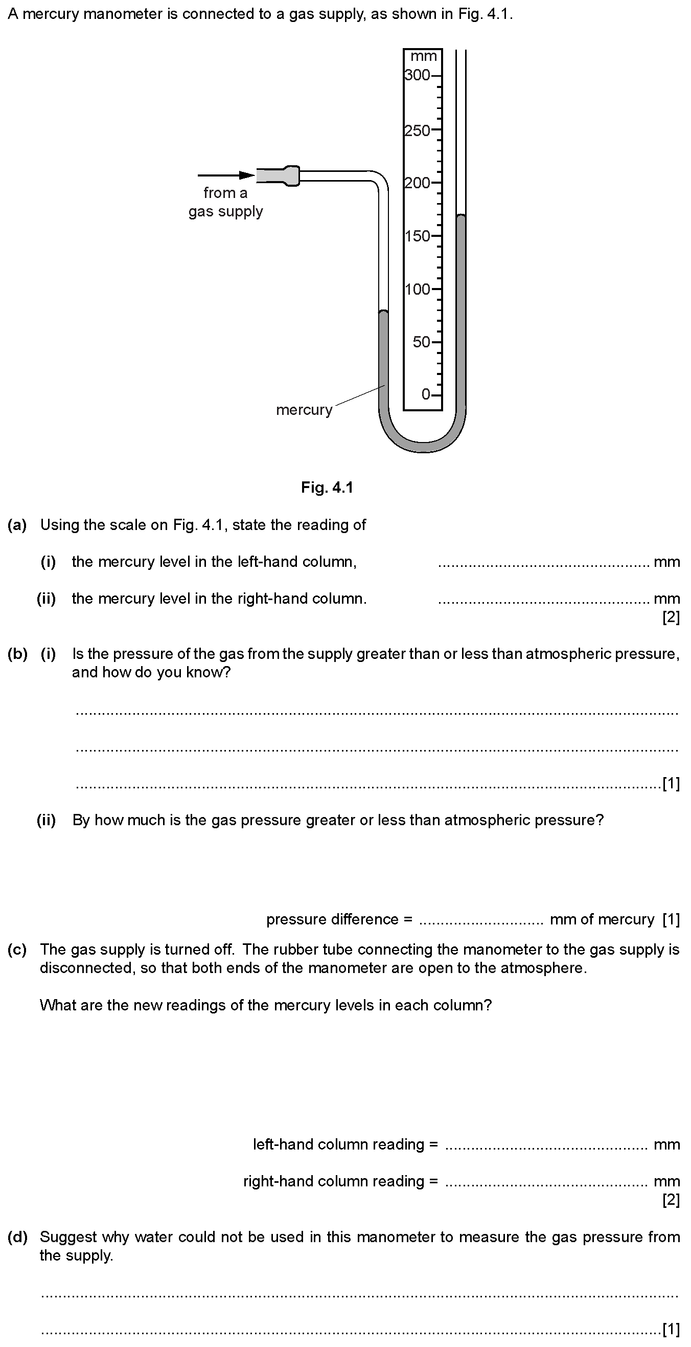 Fig. 4.1 shows a manometer, containing mercury, being used to monitor the pressure of a gas supply.(a) Using the scale on Fig. 4.1, find the vertical ...