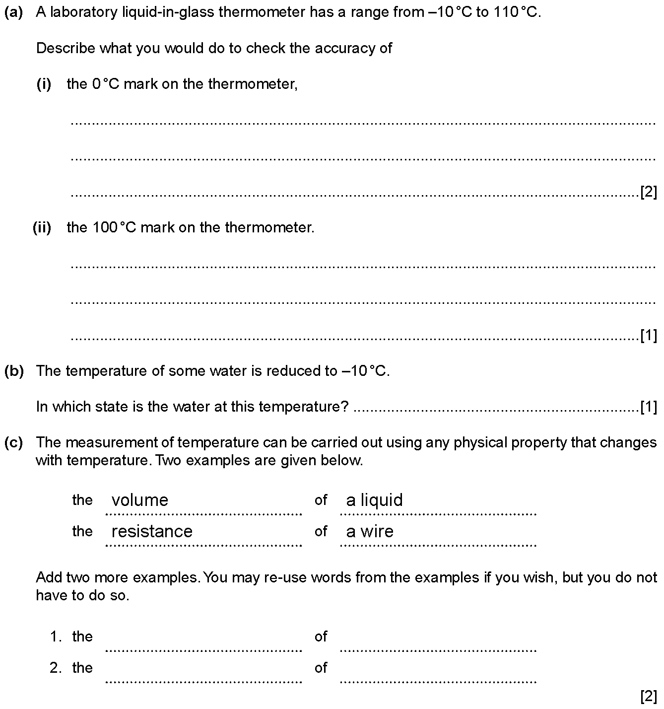 The liquid-in-glass thermometer in Fig. 6.1 has a scale from -10°C to 110°C.(a) Two of the temperatures marked on the thermometer are known as fixed...