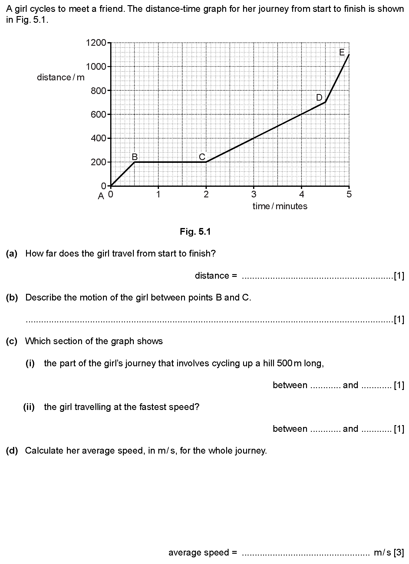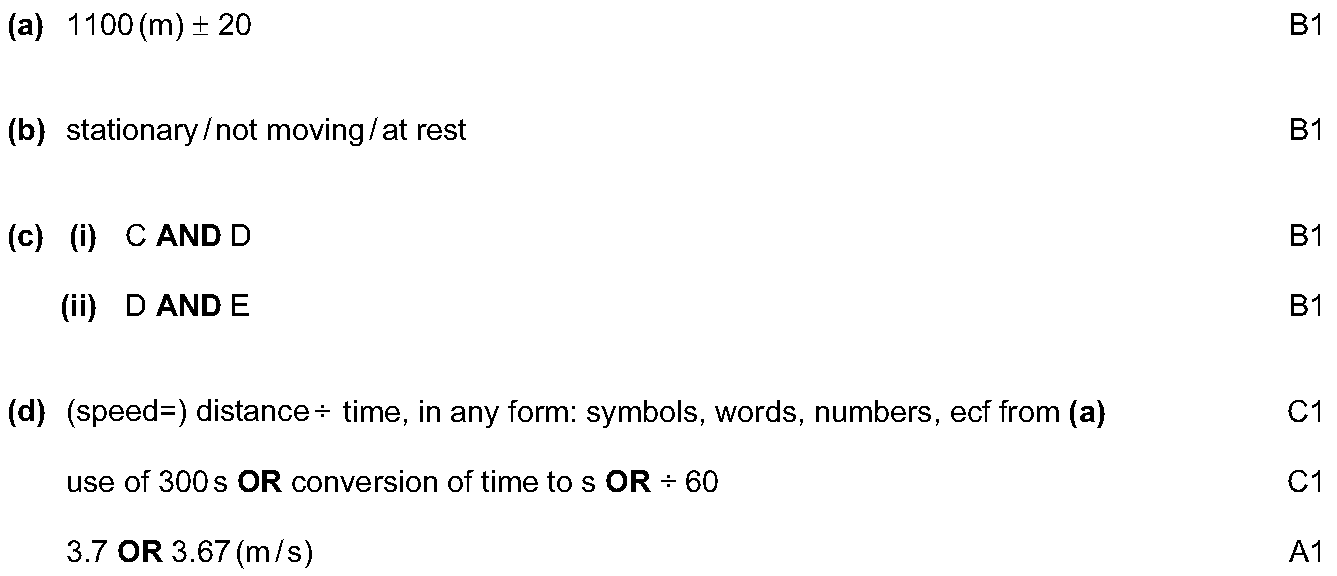 (a) Look at the distance/time graph that has been drawn for you.(i) Answer the following questions for the time interval AB.1. What is happening to th...