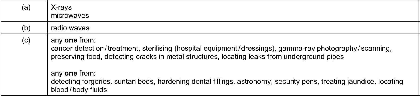 A sportsman is feared to have broken a leg, and is taken to hospital to have his leg X-rayed.(a) Complete the following sentence about X-rays.X-rays a...