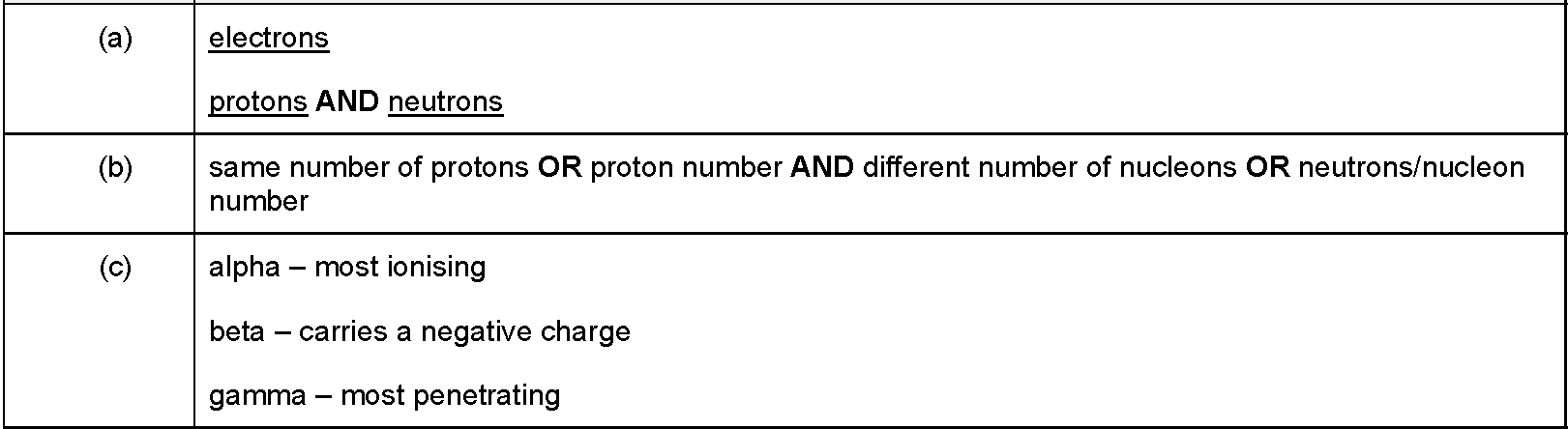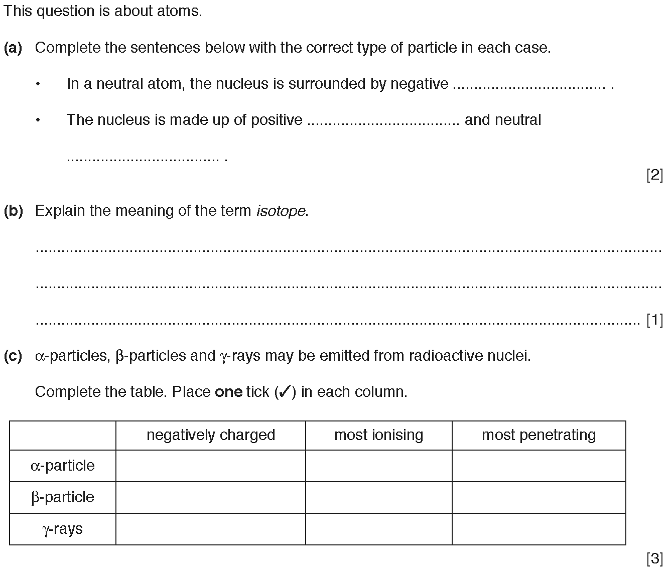 The following table includes some of the properties of alpha, beta and gamma radiations.Complete the table by filling in the missing properties.[Table...