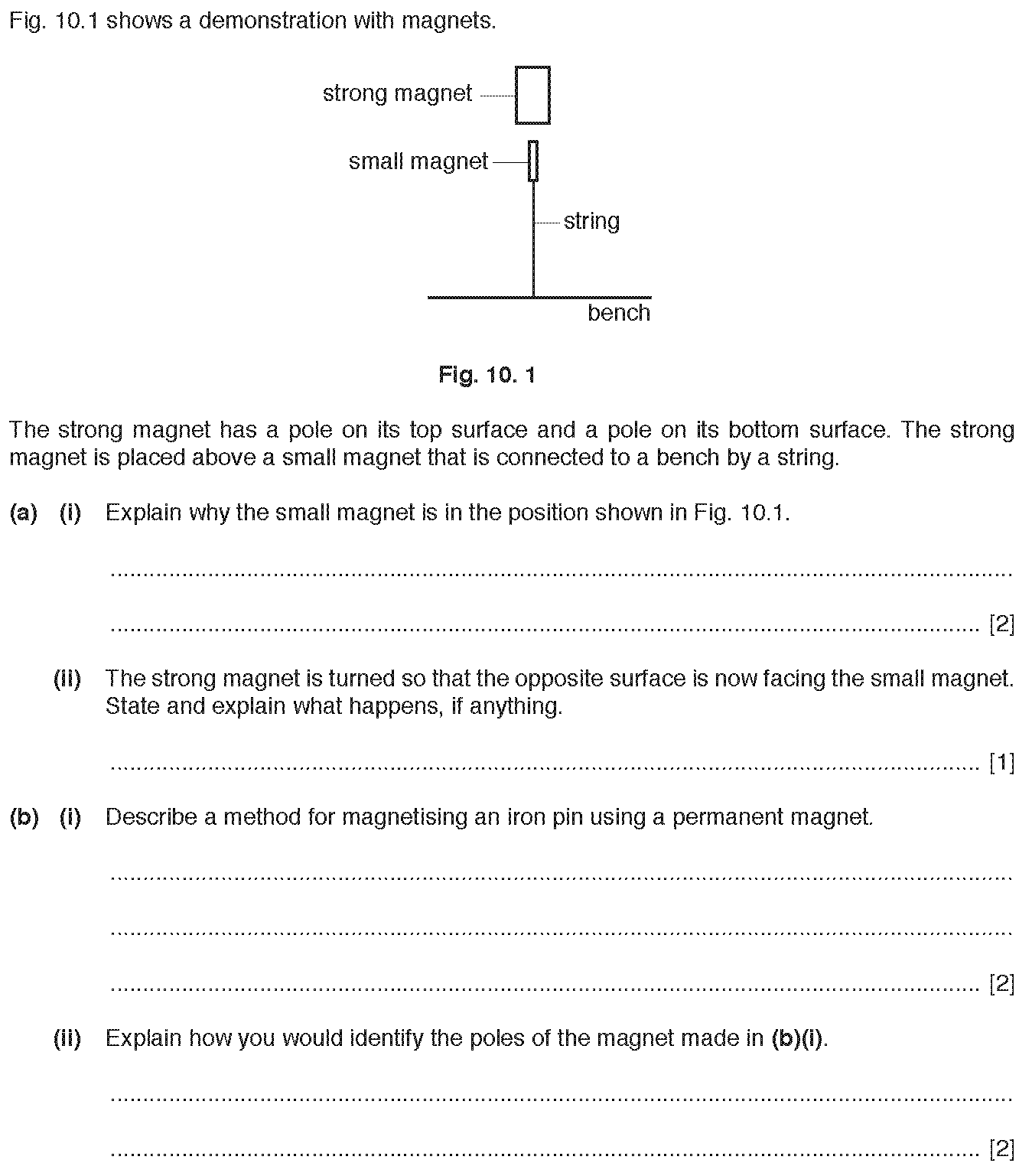 The pivoted steel arrow from a small compass has become demagnetised. The coil shown in Fig. 7.1 is to be used to magnetise it again. (a) Describe ca...