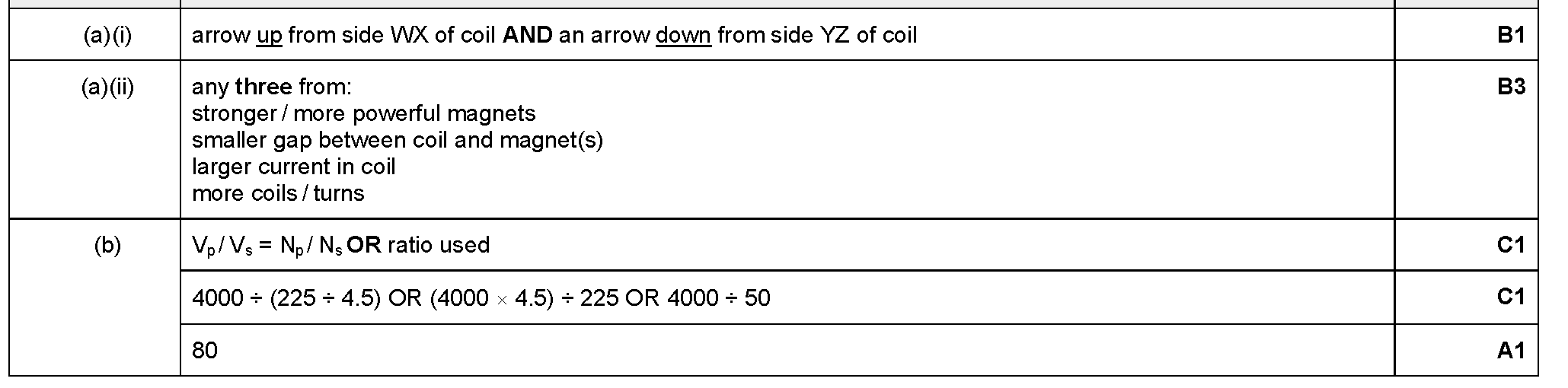 The coil in the d.c. motor in Fig. 9.1 is rotating as shown. (a) On Fig. 9.1, clearly label the coil. [1](b) State two things that could be done to th...