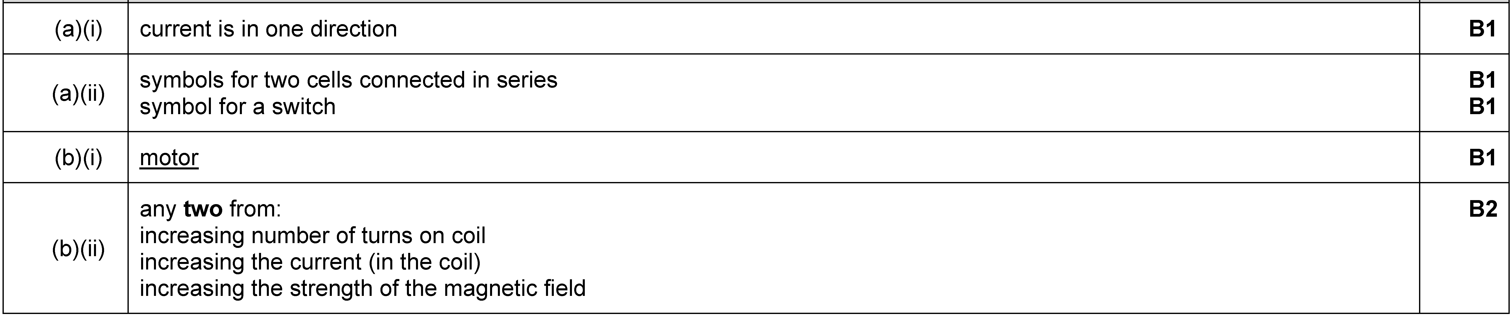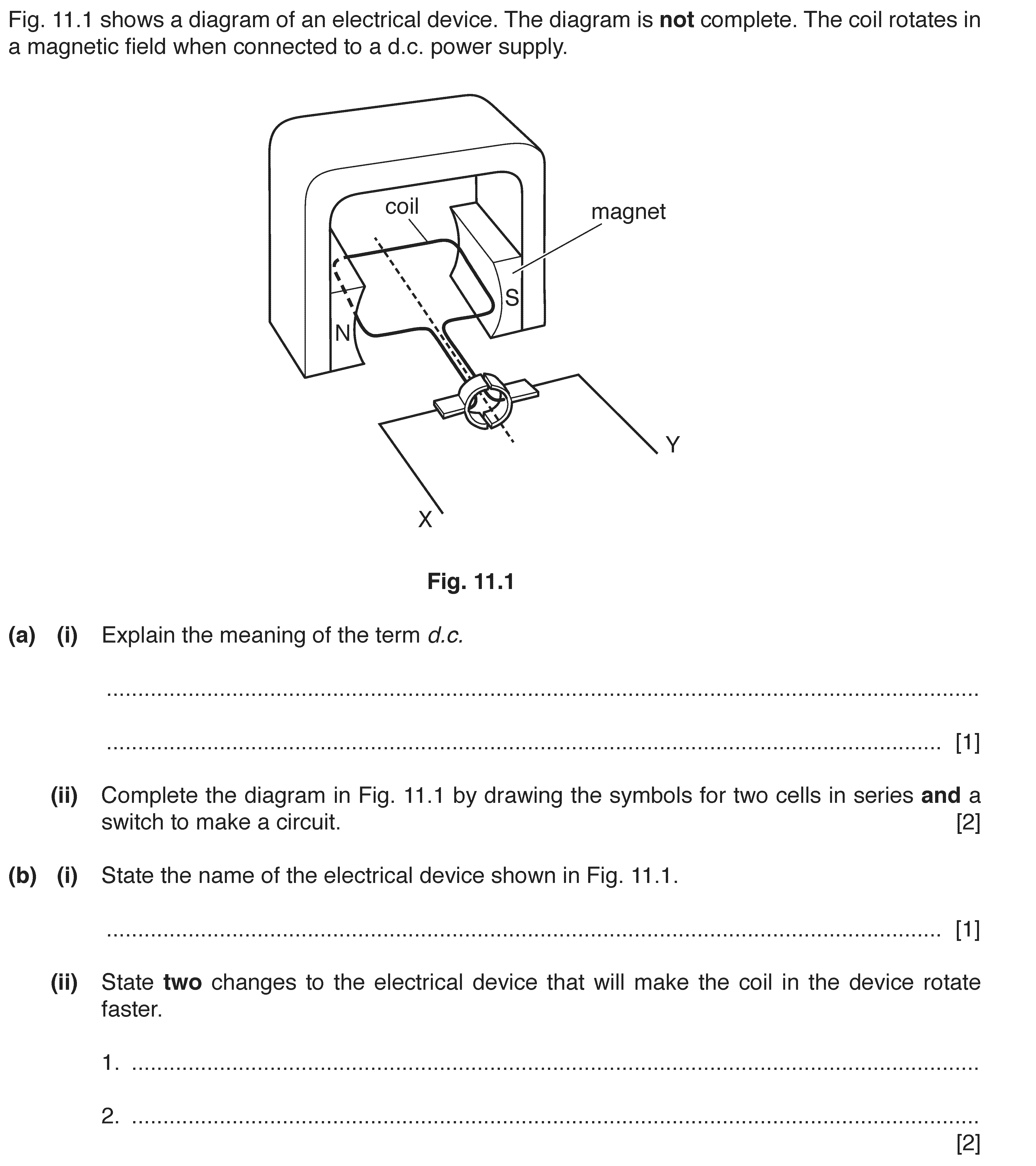 The coil in the d.c. motor in Fig. 9.1 is rotating as shown. (a) On Fig. 9.1, clearly label the coil. [1](b) State two things that could be done to th...