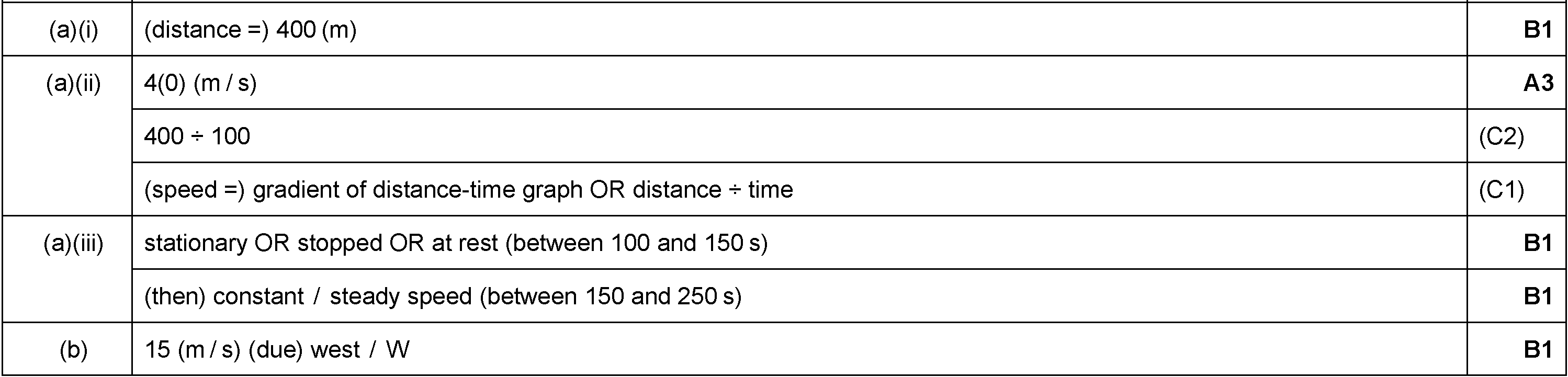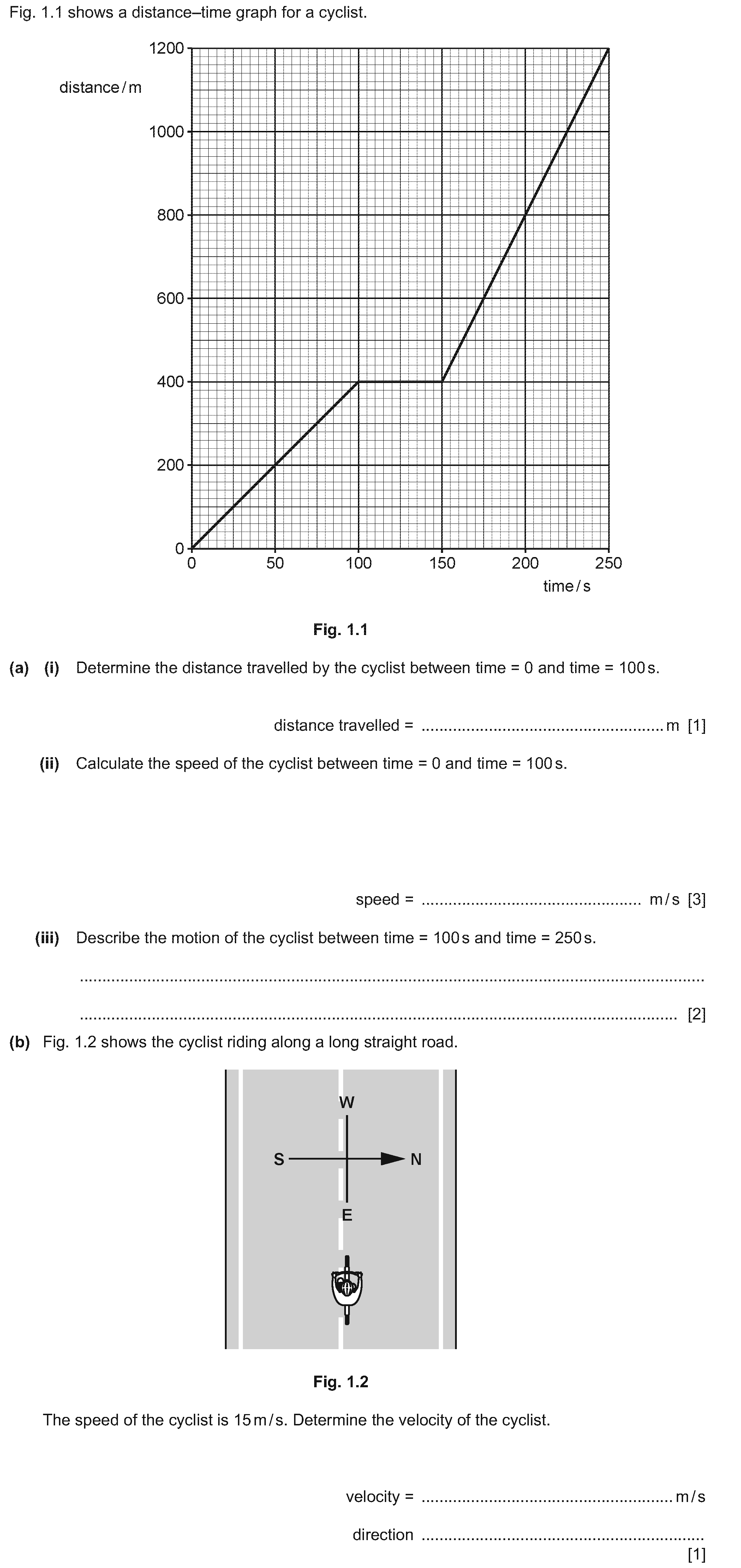 1. Fig. 1.1 shows a distance–time graph for a cyclist. (a) (i) Determine the distance travelled by the cyclist between time = 0 and time = 100 s. d...