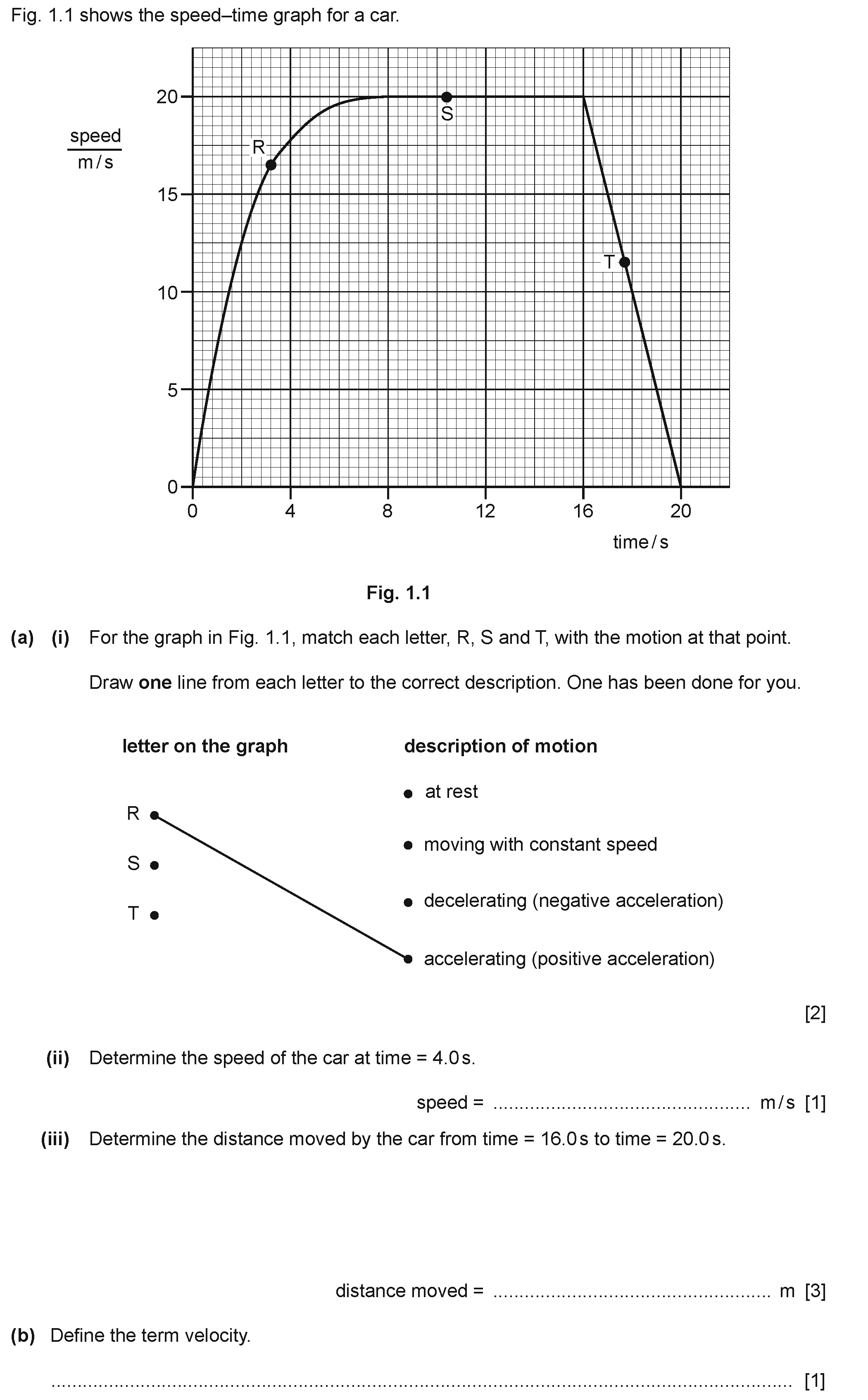 1. Fig. 1.1 shows a distance–time graph for a cyclist. (a) (i) Determine the distance travelled by the cyclist between time = 0 and time = 100 s. d...
