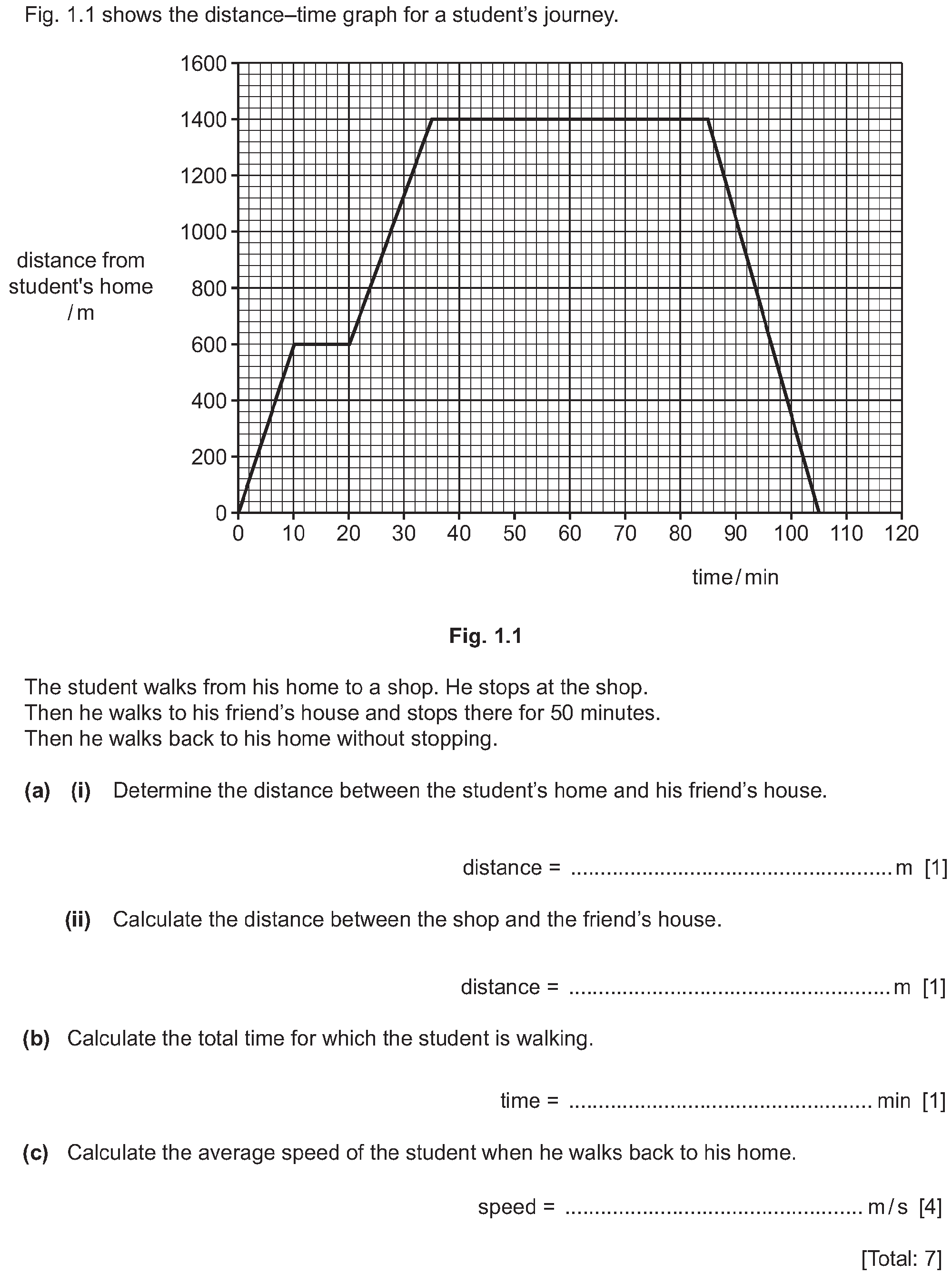 1. Fig. 1.1 shows a distance–time graph for a cyclist. (a) (i) Determine the distance travelled by the cyclist between time = 0 and time = 100 s. d...