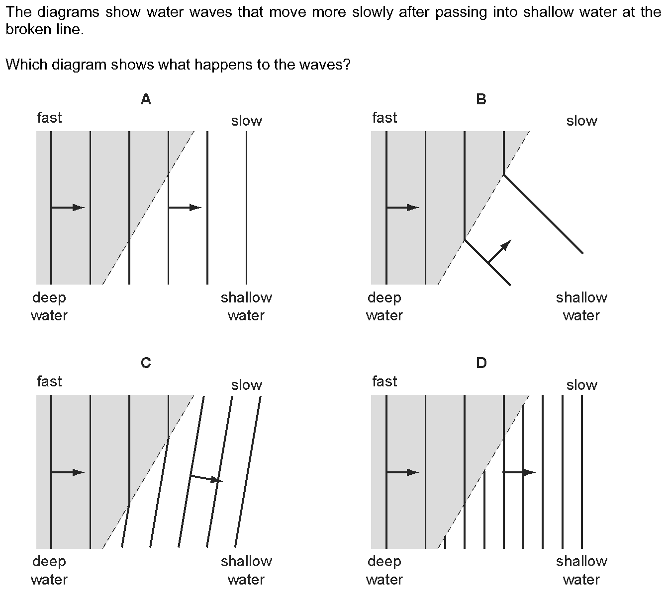 The diagrams show water waves that move more slowly after passing into shallow water at the broken line.Which diagram shows what happens to the waves?...