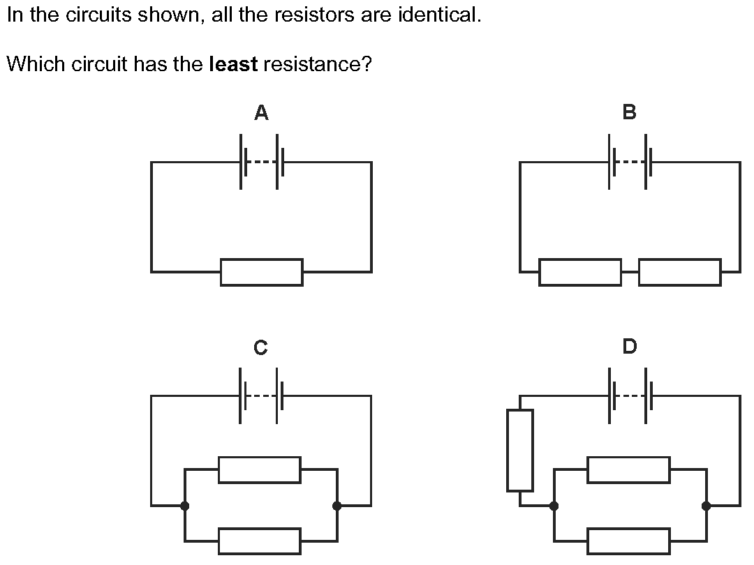 The diagrams show four arrangements of resistors.Which arrangement has the smallest total resistance?A: [Image_A with 4Ω icon]B: [Image_B with 2Ω an...