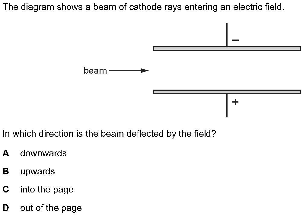 An electric field is set up between two parallel plates.An image is shown with cathode rays directed into this field, parallel to the plates: In which...