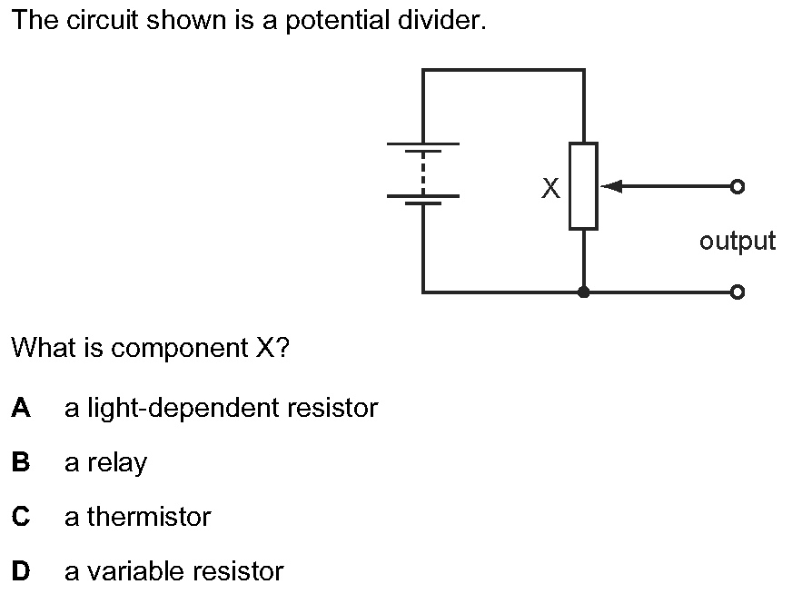 (a) In Fig. 10.1, A is a 1000Ω resistor, C is a transistor, and D is a lamp. S is a 9V supply. ![Image_1: Fig. 10.1](#)(i) Name the component labelle...