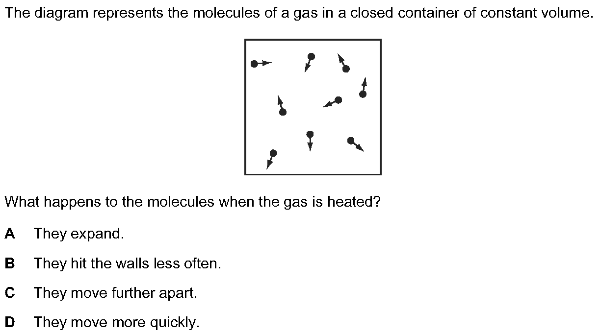 The molecules of a substance become more closely packed and move more quickly.What is happening to the substance?A A gas is being heated and compresse...