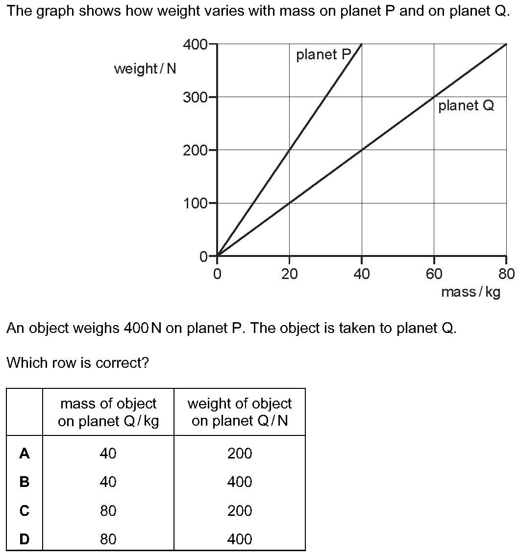 The graph shows how weight varies with mass on planet P and on planet Q.An object weighs 400 N on planet P. The object is taken to planet Q. Which row...