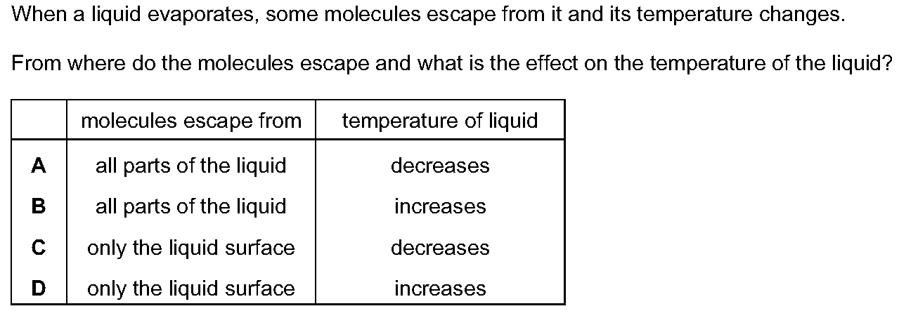 In an experiment, some of a substance changes from a liquid to a gas. The temperature of the remaining liquid changes because of this.What is the name...