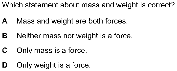 Which statement about mass and weight is correct?A. Mass and weight are both forces.B. Neither mass nor weight is a force.C. Only mass is a force.D. O...