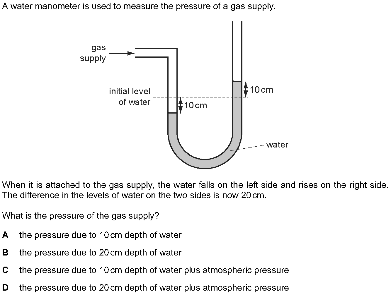 What is a simple mercury barometer designed to measure?A. the pressure beneath a liquidB. the pressure of a gas supplyC. the pressure of car tyresD. t...