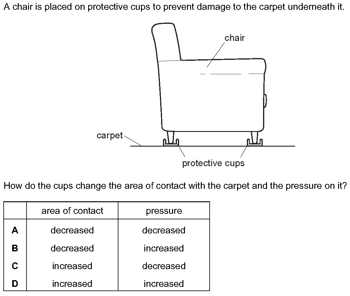 A chair is placed on protective cups to prevent damage to the carpet underneath it. How do the cups change the area of contact with the carpet and the...