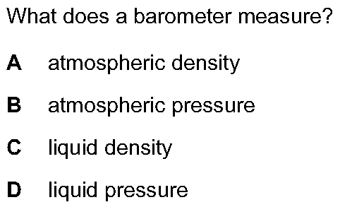 What is a simple mercury barometer designed to measure?A. the pressure beneath a liquidB. the pressure of a gas supplyC. the pressure of car tyresD. t...