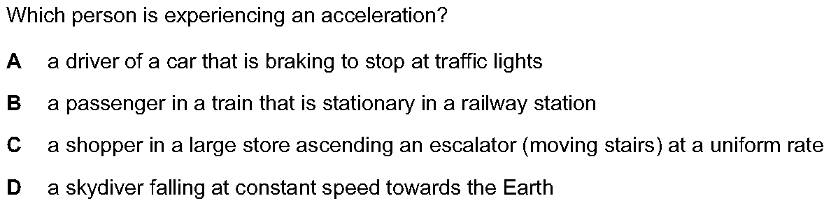 Which person is experiencing an acceleration?A. a driver of a car that is braking to stop at traffic lightsB. a passenger in a train that is stationar...